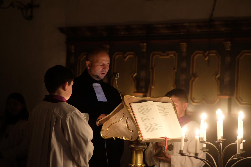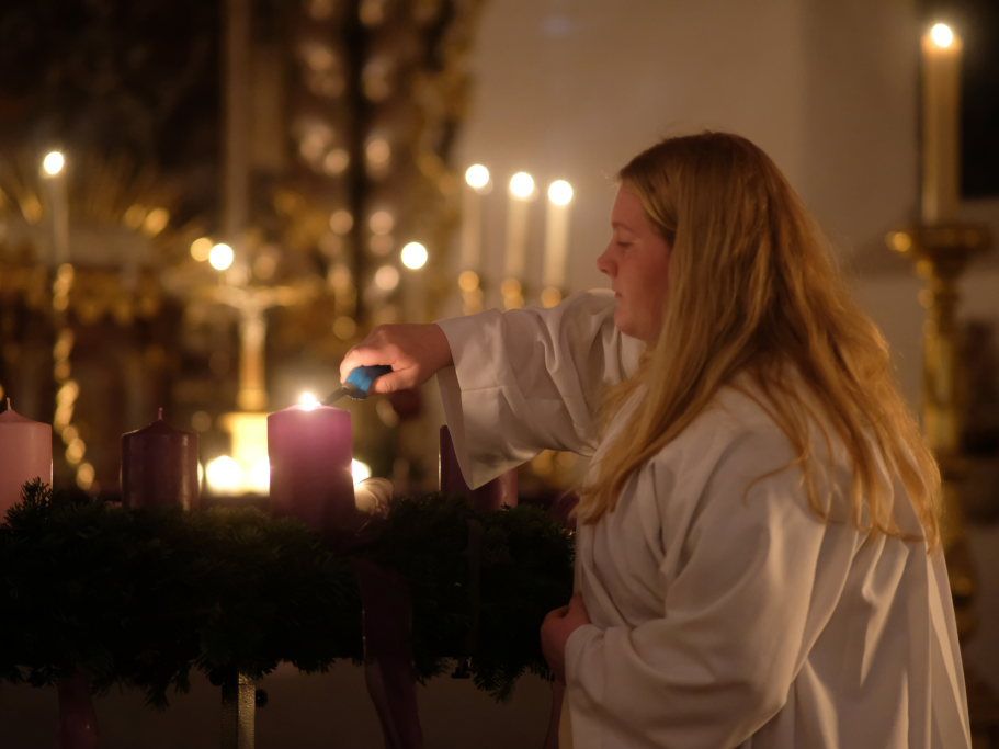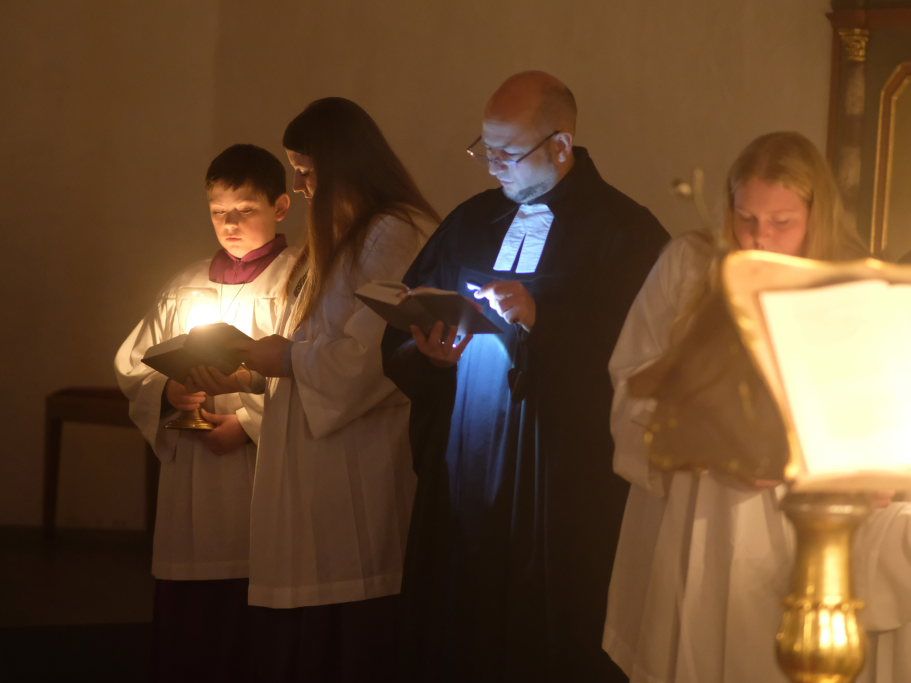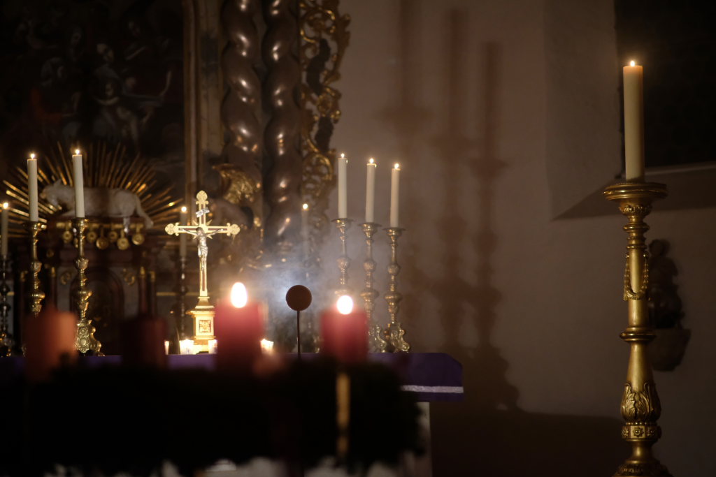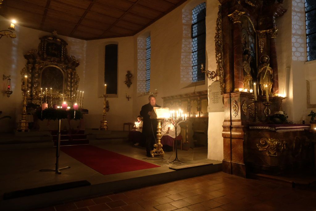 Nach der Lesung aus dem Lukas-Evangelium über die Ankunft des Menschensohnes verlas er die Fürbitten, in denen er besonders den Opfern von zahlreichen Kriegen, die aktuell auf der Erde toben, gedachte und welche die Besucher gemeinsam mit dem Jugendchor gesanglich beantworteten. Bei jeder Fürbitte sorgte eine Ministrantin dafür, dass am Altar jeweils ein wenig Weihrauch als Opfergabe dargebracht wurde.