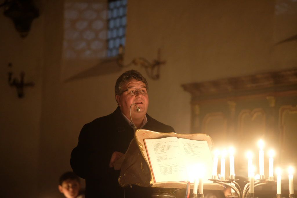 Pfarrer Jan Gruzlak freute sich an diesem Zweiten Advent, nachdem der Jugendchor die Besucher musikalisch eingestimmt hatte, bei seiner Begrüßung, dass die wunderbar illuminierte Kirche so gut gefüllt war. Er verwies darauf, dass die beiden ersten Kerzen am Adventskranz wie die vielen anderen Kerzen noch nicht entzündet waren. Dies wurde von einer Ministrantin von allen sichtbar nachgeholt. In seiner „Adventsgeschichte bei Kerzenschein“ erzählte danach der Pfarrer die Geschichte eines Jungen, der obwohl eigentlich ganz zufrieden lebend, sich plötzlich dem allgemeinen gesellschaftlichen Wettkampf des „mehr haben und mehr sein wollens“ anschloss, sich dabei – nicht nur körperlich – vollends übernimmt und erst nach einem Quasi-Zusammenbruch feststellt, was im Leben wichtig ist. Denn nachdem er seine Freunde und sein ganzes Eigentum verloren hatte, wurde ihm in der Zwiesprache mit seinem Schöpfer bewusst, was wirklich im Leben zählt, dass nämlich jeder Mensch einmalig ist – und zwar genauso wie er ist.