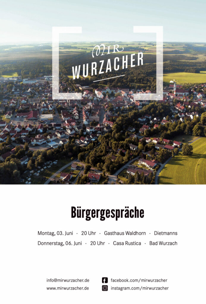 „Mir Wurzacher“ laden Euch alle recht herzlich zu unseren Bürgergesprächen ein. Bei diesen Begegnungen möchten wir die Gelegenheit nutzen, um uns persönlich vorzustellen, mit Euch ins Gespräch zu kommen, Eure Fragen zu beantworten und Eure Anregungen mitzunehmen. Über Euer Interesse freuen sich