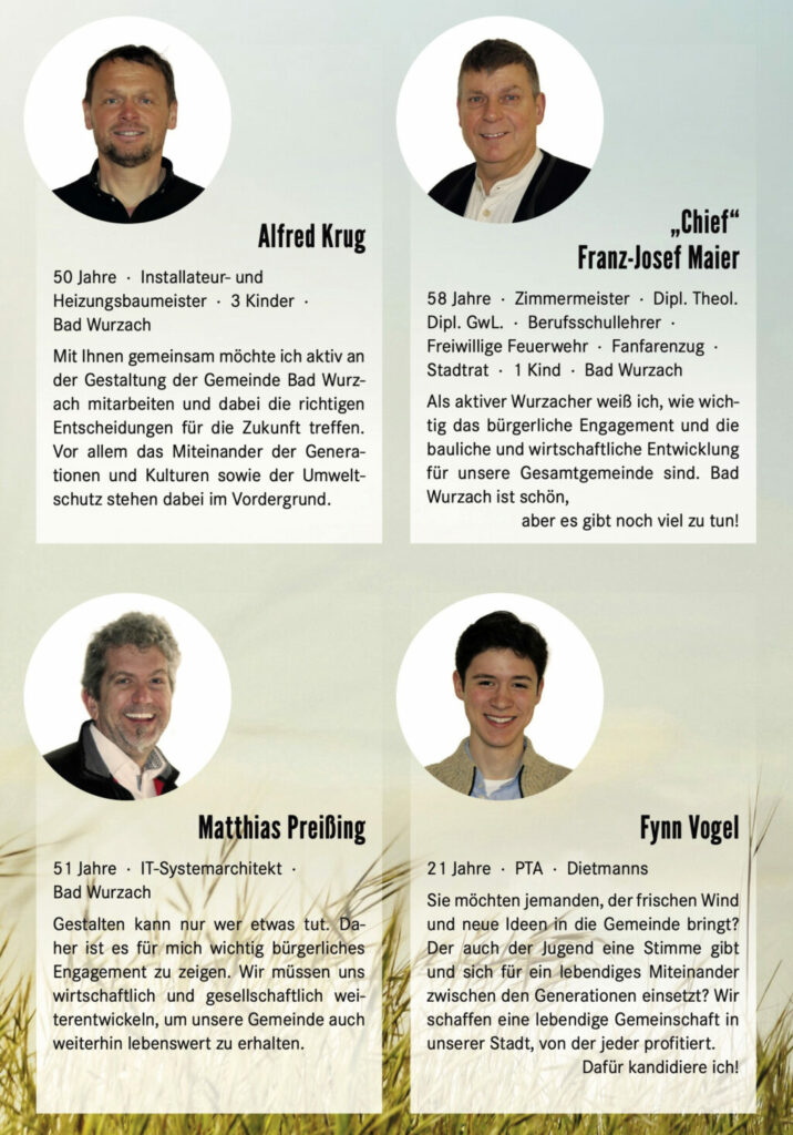 Bad Wurzach (dbsz) – Die Kandidierenden der Liste „Mir Wurzacher“ laden zu Bürgergesprächen ein. Nachstehend die Einladung und die vier Seiten aus dem Wahlprospekt: