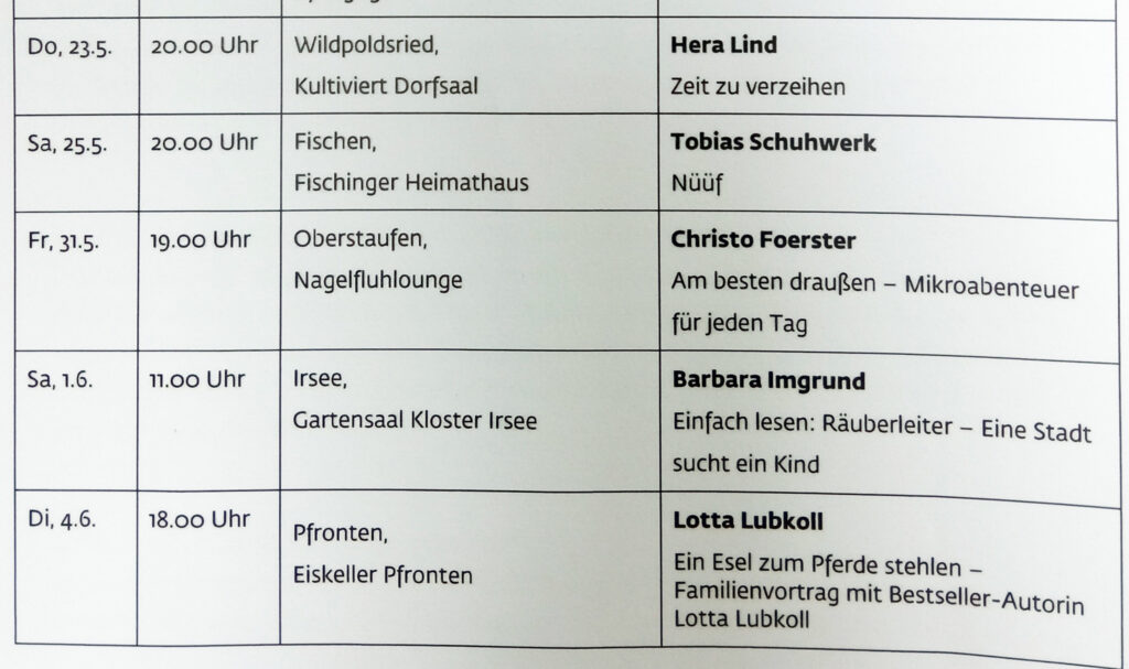 Nachstehend eine Übersicht über die restlichen Angebote des Allgäuer Literatur-Festivals.