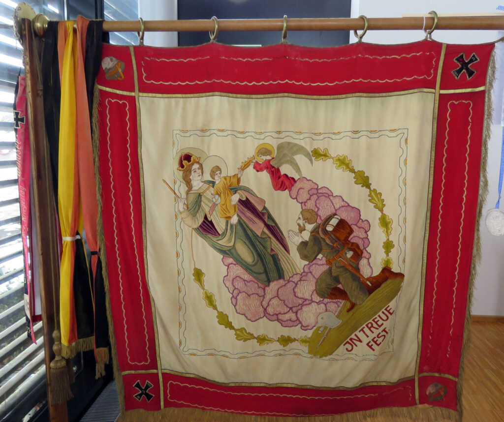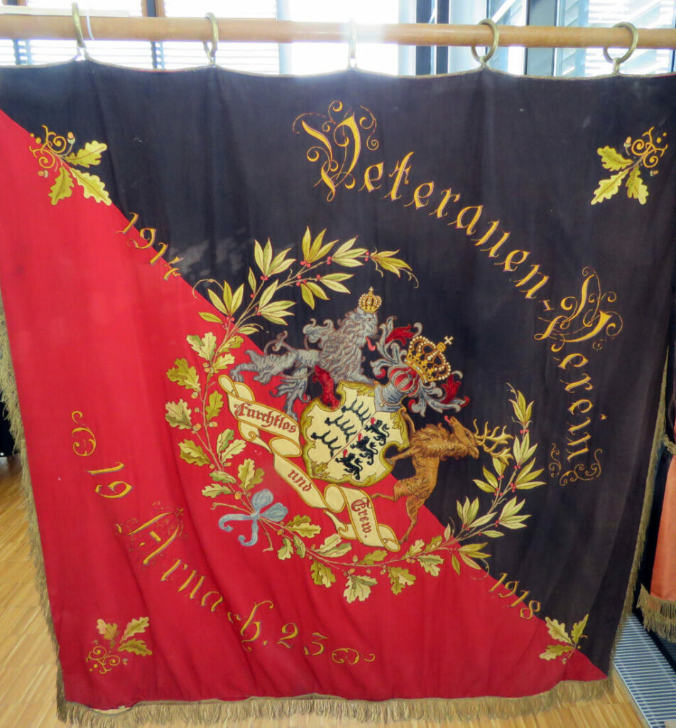 Die 100-jährige Fahne das Arnacher Veteranenvereins (heute: Soldaten- und Schützenkameradschaft). Obwohl Württemberg 1923 seit viereinhalb Jahren kein Königreich mehr war, sondern eine Republik mit einem Staatspräsidenten, trägt die Fahne ein bekröntes Wappen.