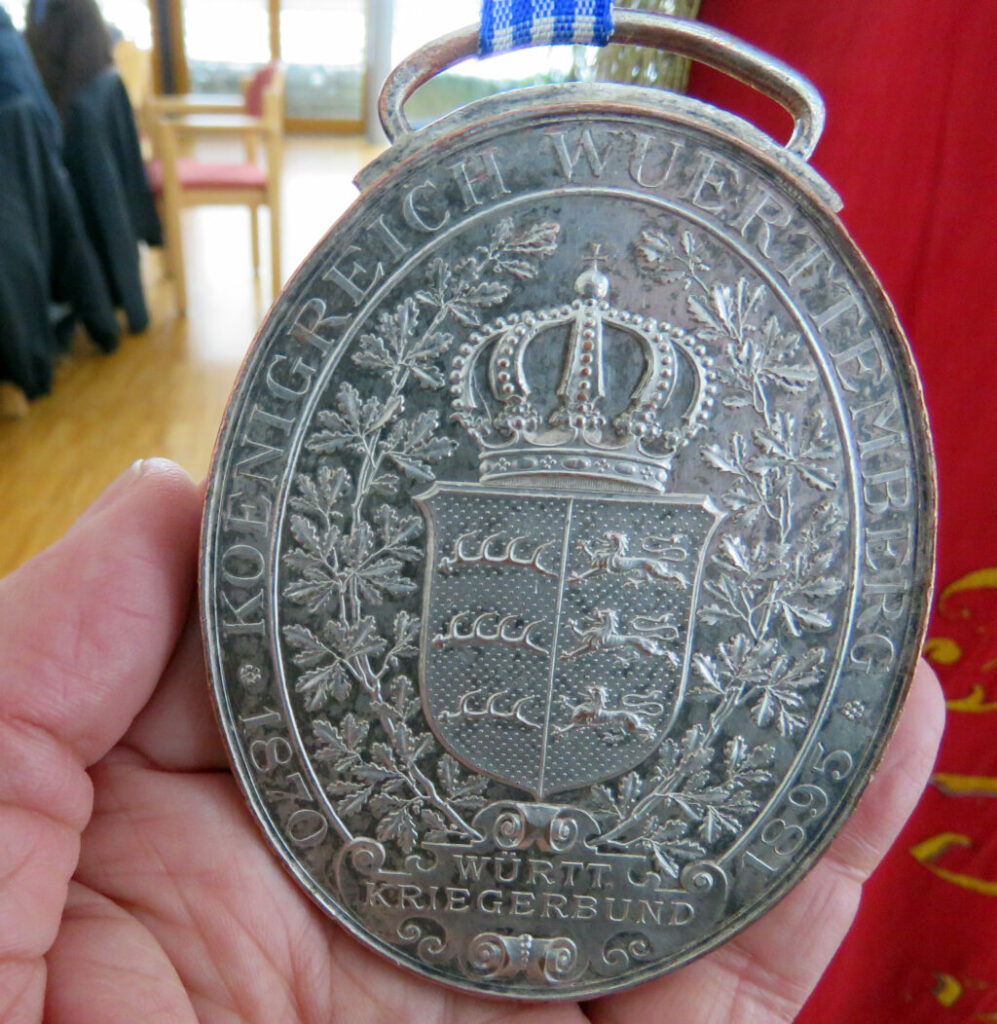 Im Saal wurde die Kriegervereinsfahne von 1923 ausgestellt. Gebhard Baumann hatte auf das 100-Jahr-Jubiläum der Fahne aufmerksam gemacht und auch entsprechende Informationen beigebracht. Weiter wurde eine vom württembergischen König Wilhelm II. gestiftete Medaille gezeigt, die ab 1895 für Krieger- und Veteranenvereine bei ihrem 25-jährigen Bestehen verliehen wurde; der Arnacher Verein hat die Medaille, die an der Fahne getragen wurde, demnach im Jahre 1901 verliehen bekommen.