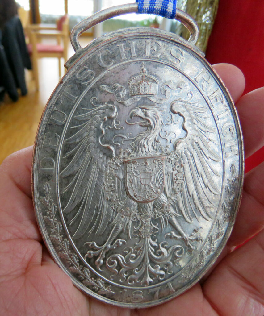 Die Rückseite der württembergischen Fahnenmedaille von 1895 für Kriegervereine zeigt den Reichsadler und die Umschrift DEUTSCHES REICH sowie die Jahreszahl 1871, das Jahr der Reichsgründung.