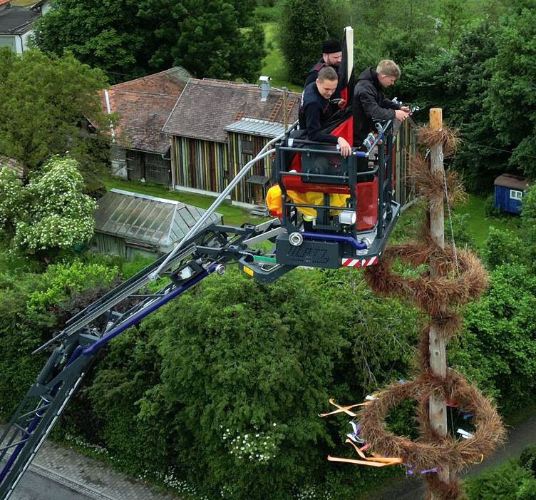 Fahne im Korb: Drei Feuerwehrmänner bringen an der Spitze des Arnacher Maibaums Schwarz-Rot-Gold an.