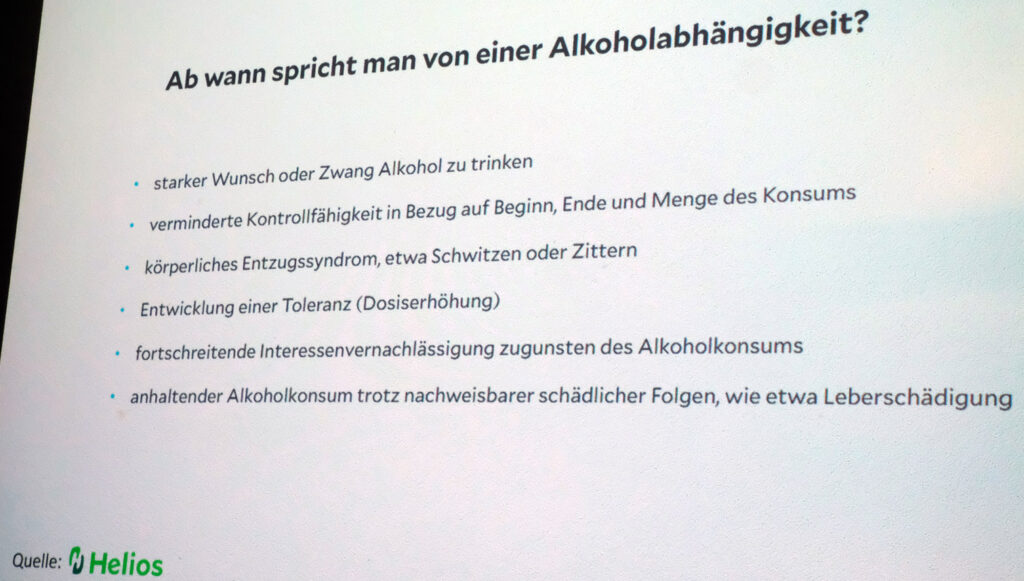 „Ab wann spricht man von einer Alkoholabhängigkeit?“ Wenn der Wunsch Alkohol zu trinken zwanghaft wird und wenn die Kontrollfähigkeit bezüglich des Konsums ausgeschaltet ist. Körperliche Entzugserscheinungen sind Schwitzen oder Zittern. Wenn ständig die Dosis erhöht werden muss, andere Interessen zugunsten des Alkoholkonsums vernachlässigt werden und trotz nachweislich schädlicher Folgen weiterkonsumiert wird.