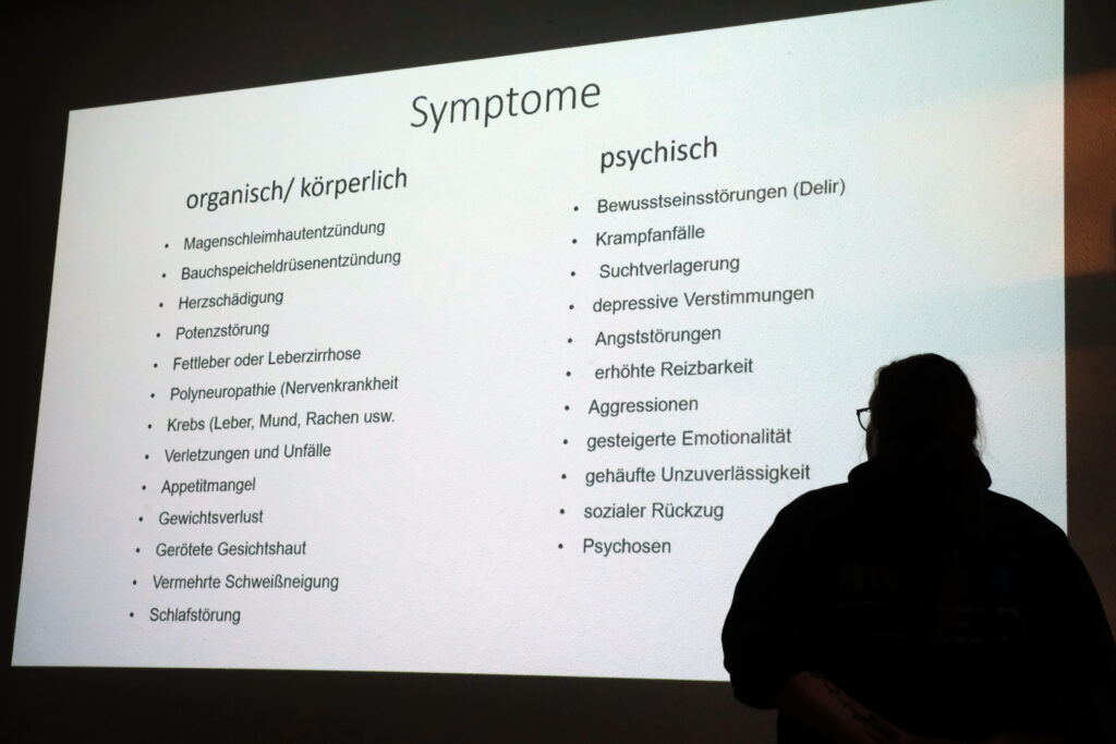 Mohrmann zeichnete für das rund 40-köpfige Publikum – zumeist Mütter – den Weg vom Genuss bis zur Abhängigkeit mit Alkohol nach. Vom Genuss, bei dem die angenehme Wirkung im Vordergrund steht, über den Missbrauch, bei dem die Substanzen etwa die Stimmung heben oder Sorgen vergessen lassen sollen, führt der Weg über die Gewöhnung zur Abhängigkeit. Das problematische am Alkohol: Er kann sowohl beruhigend als auch aufputschend wirken.