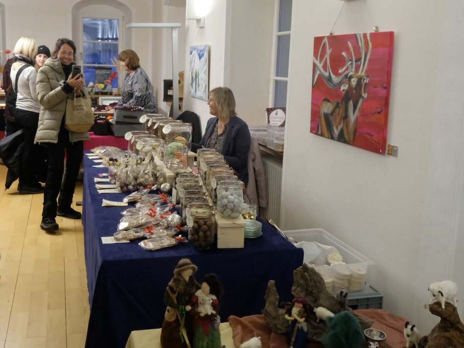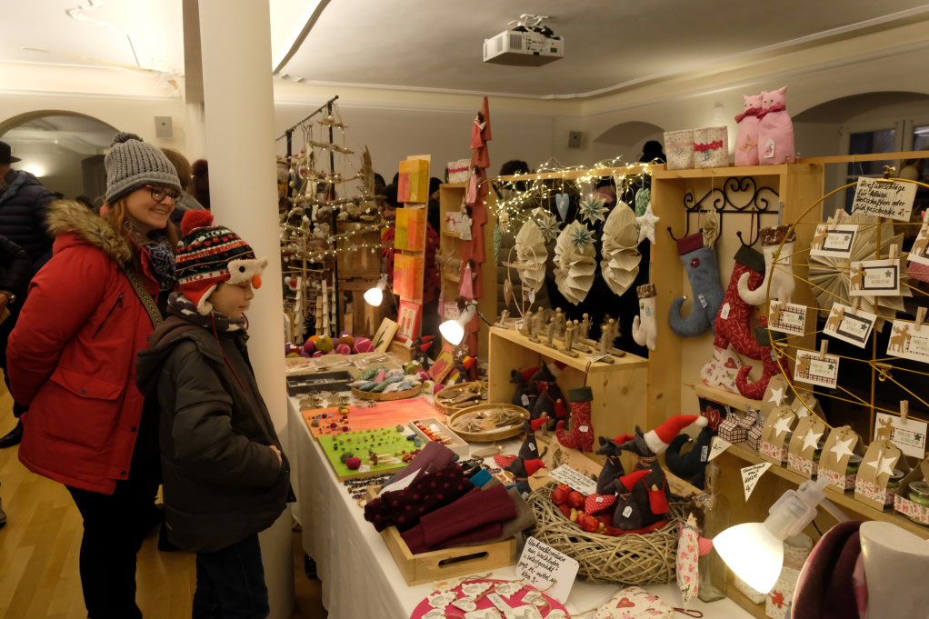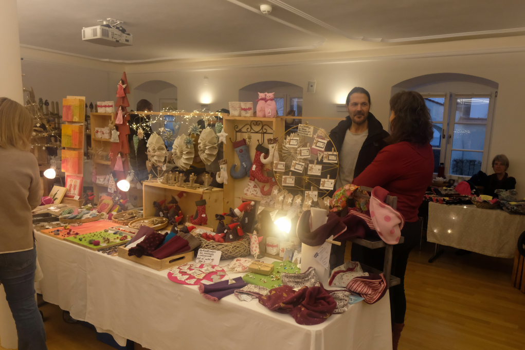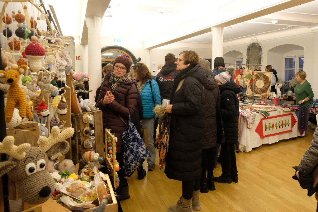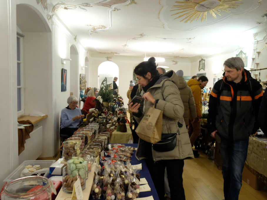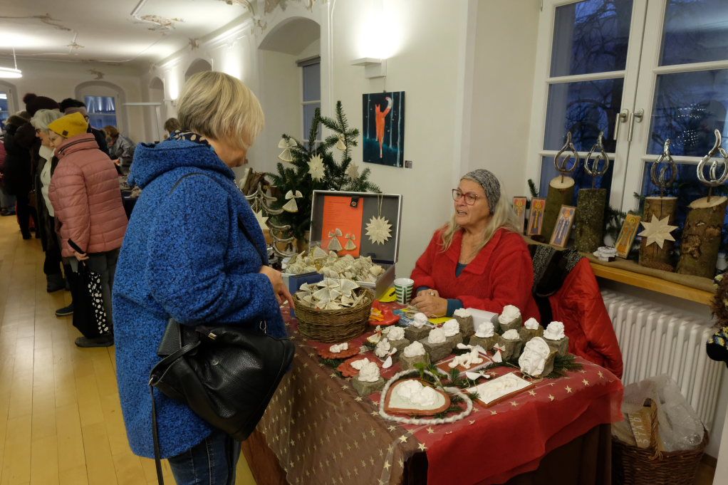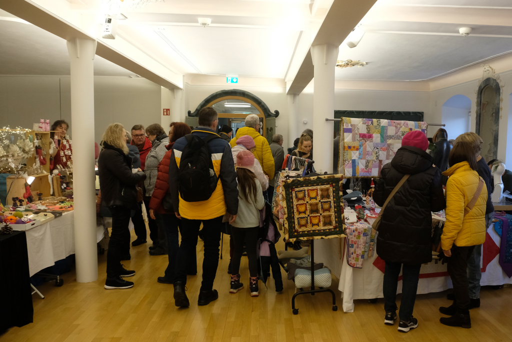 Im Sitzungssaal (Erdgeschoss) und in der Stadtbücherei (2.OG) im Kapitelsaal von Maria Rosengarten konnten wieder Künstler und Kunsthandwerker ihre Werke präsentieren. Etwa Krippen oder Baumschmuck aus dem „Koffer voller Engel“. Im Nebenraum des Sitzungssaales konnte man sich – besonders am nebelkalten Samstag – im Liederkranzcafé in heimeliger Atmosphäre aufwärmen und bei Kaffee und Kuchen nette Gespräche führen.