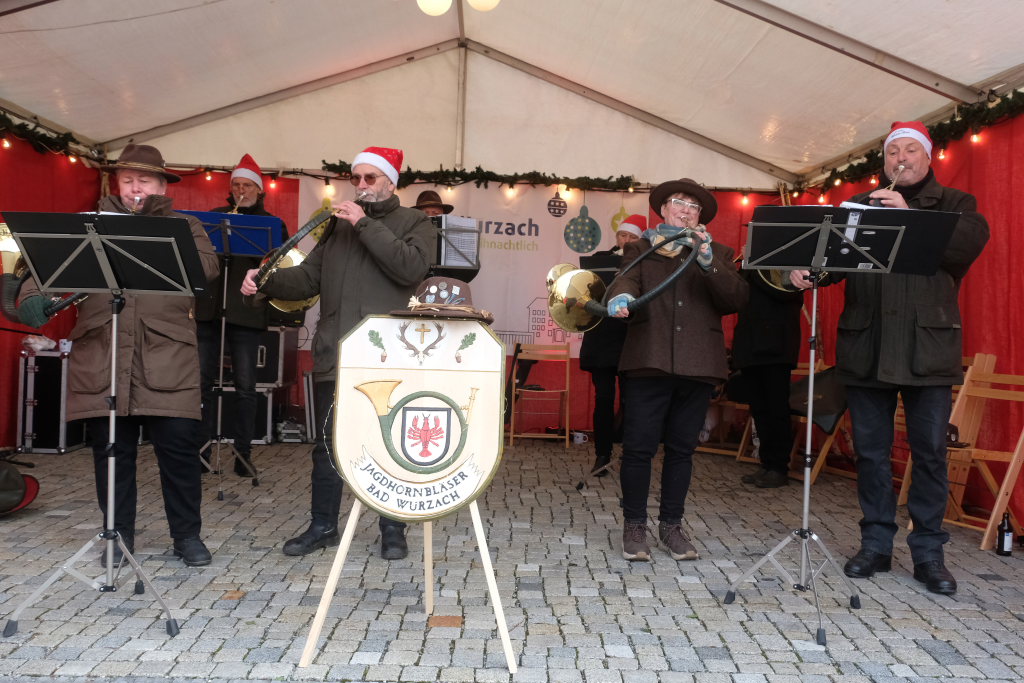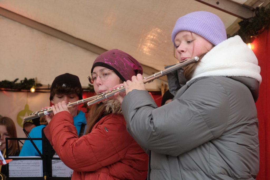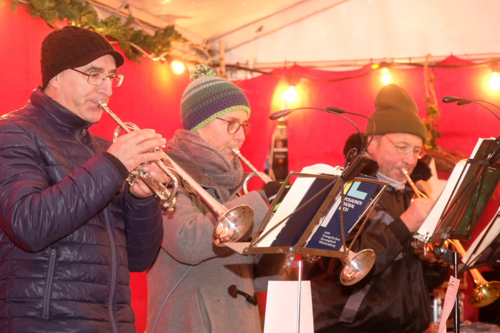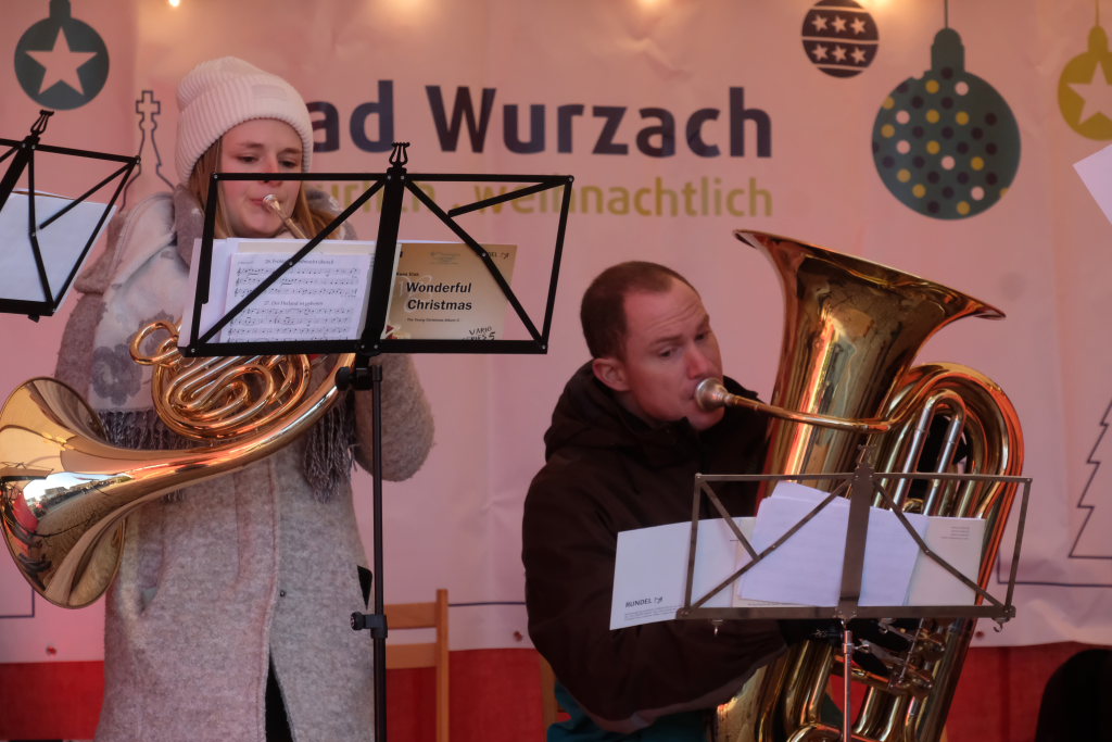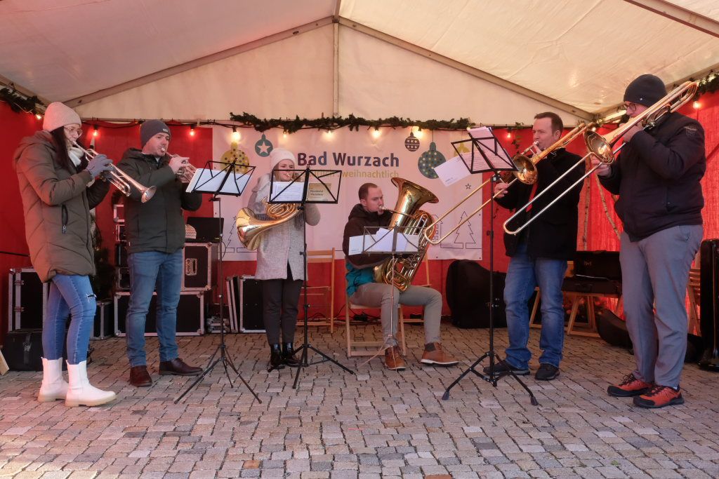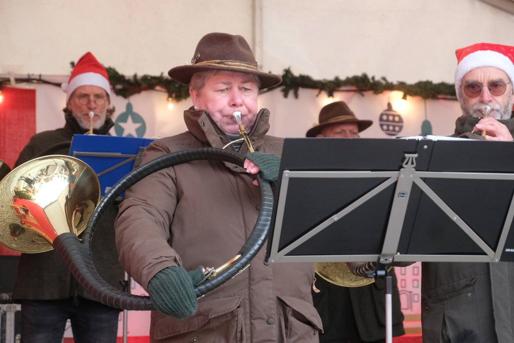 Dort schlug dann an beiden Tagen das musikalische Herz des Weihnachtsmarktes. Verschiedene Ensembles der Jugendmusikschule, das Akkordeon-Orchester von Dorith Strobel, der evangelische Posaunenchor und auch das Duo Stringendo entboten bis zum frühen Abend musikalische Advents- und Weihnachtsgrüße. Neu waren dort dann am Sonntag die Jagdhornbläser Bad Wurzach, der Musikverein Seibranz schickte seinen Nachwuchs, während beim Musikverein Haidgau Dirigent Alexander Werner dann selbst zur Posaune griff und gemeinsam mit einer erlesenen Auswahl seiner Haidgauer Musiker Weihnachtsstimmung verbreitete, ehe das Alphorn-Quintett Albers für das musikalische Finale sorgten.
