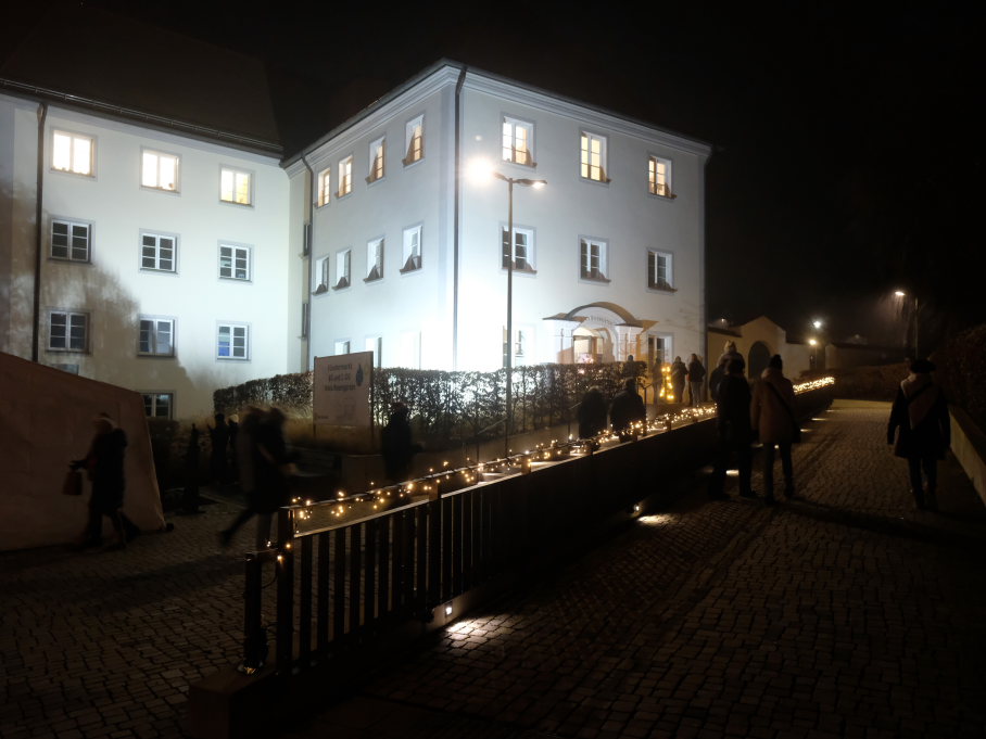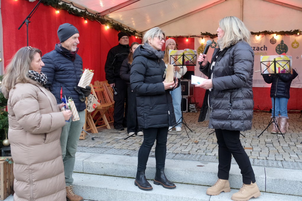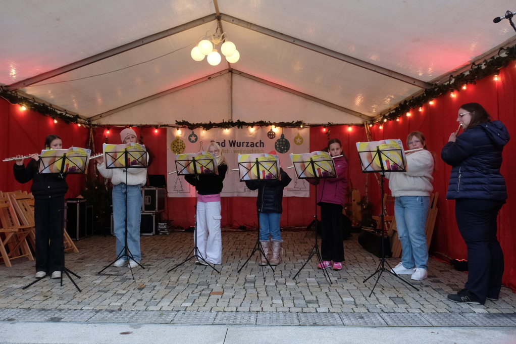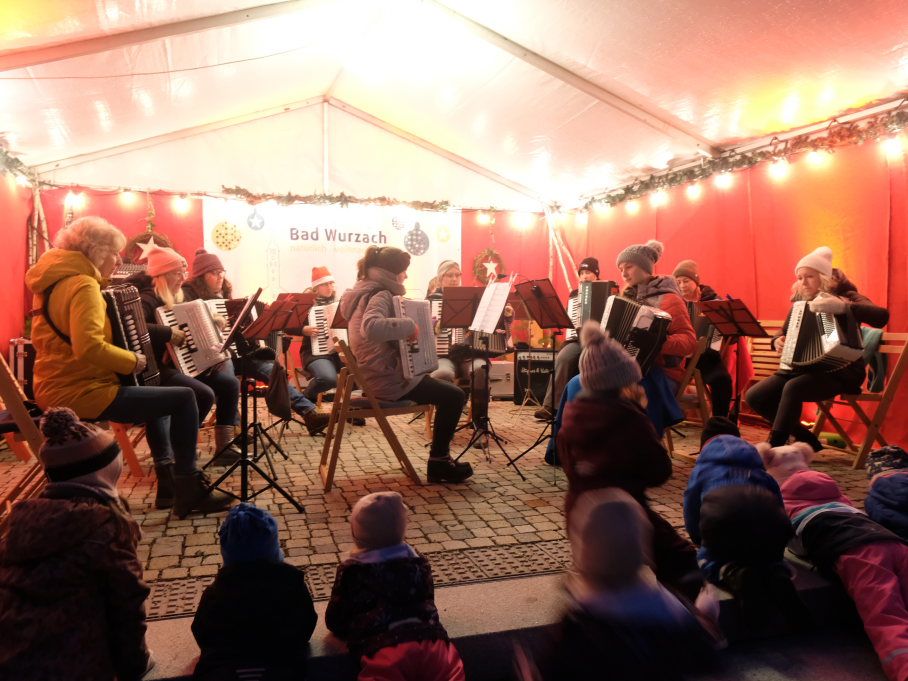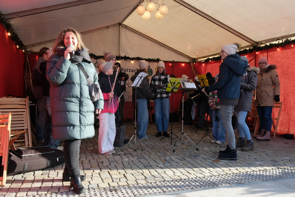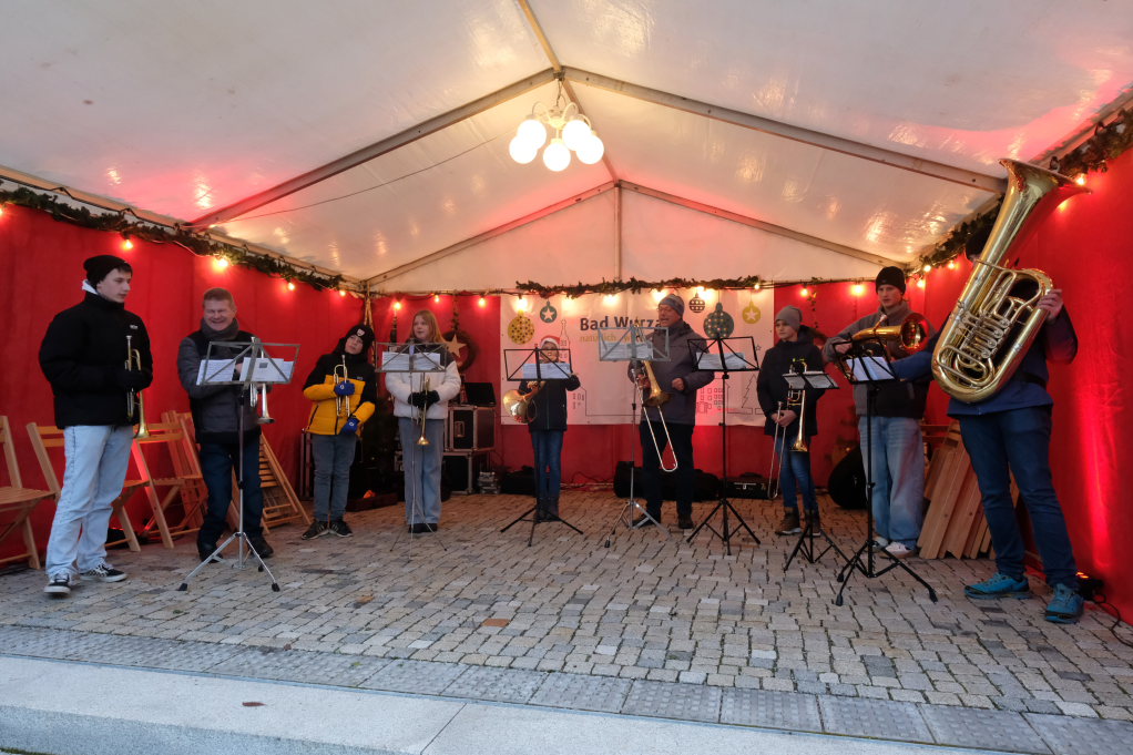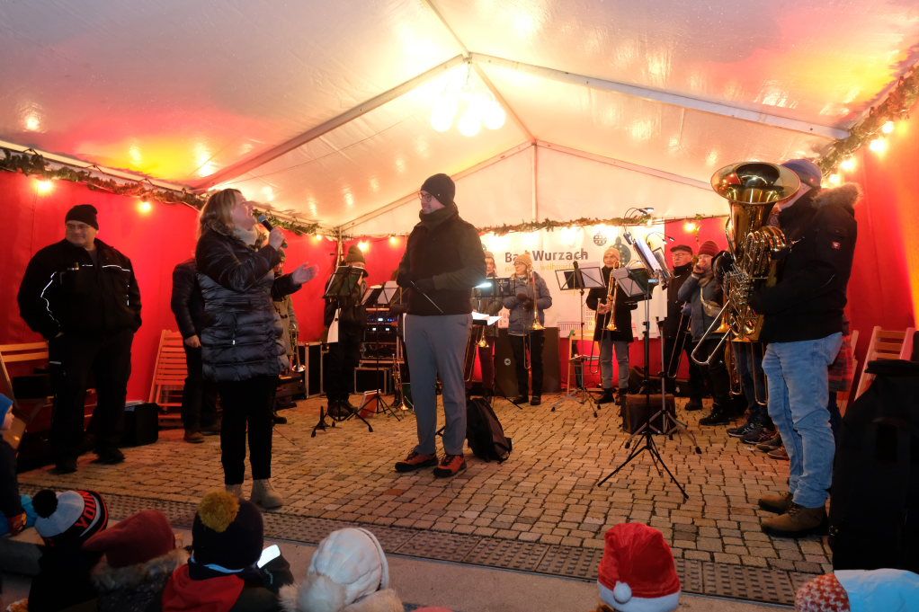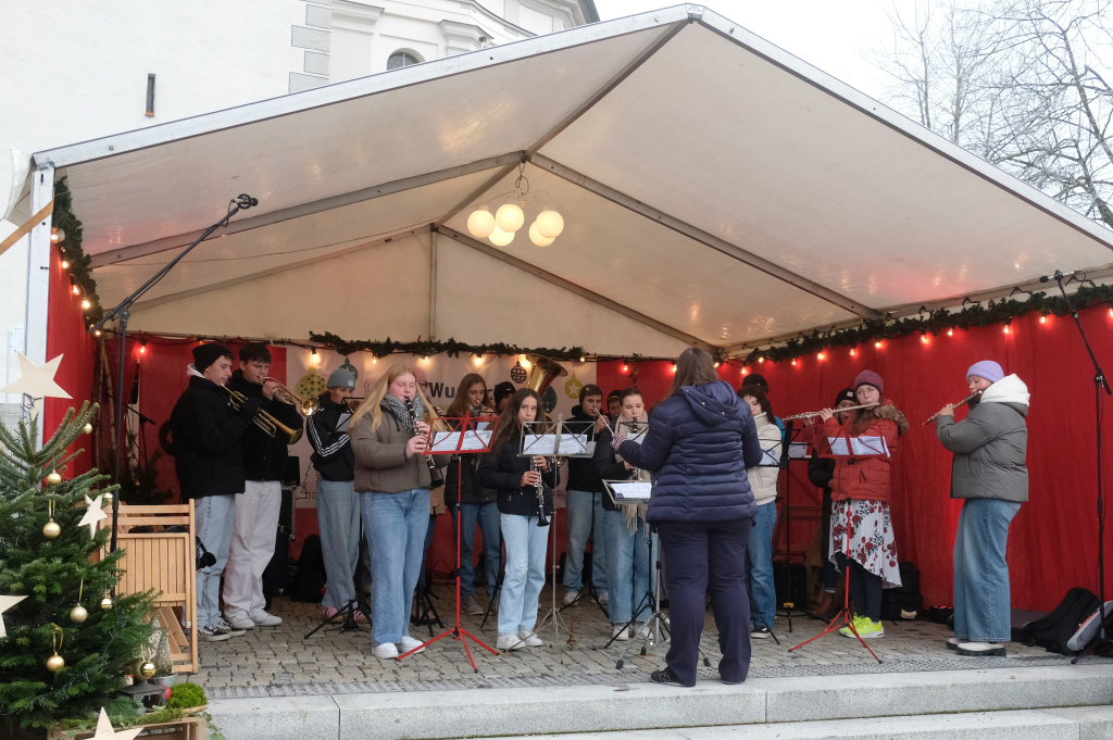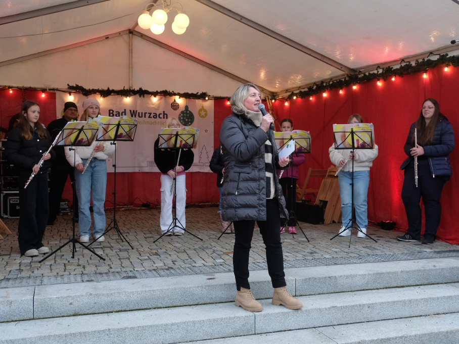 Der Markt startete auf der Bühne auf dem Klosterplatz musikalisch mit der Jugendkapelle erstmals unter der Leitung von Eva Maria Oberleiter. Hier eröffnete dann im Anschluss an den Auftritt der JuKa Bürgermeisterin Alexandra Scherer mit einem Grußwort den von den Damen der Bad Wurzach Info gemeinsam mit Petra Greiner und Gisela Brodd organisierten diesjährigen Bad Wurzacher Weihnachtsmarkt auf der kleinen Bühne zu Füßen der St. Verena Kirche.