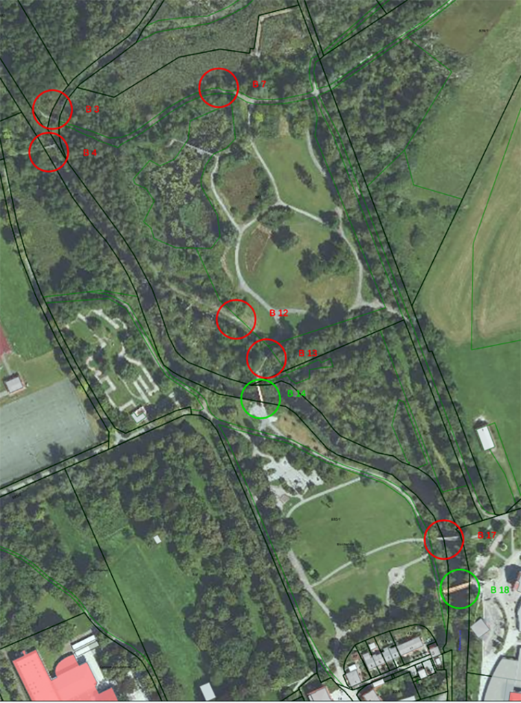Die Grafik stammt aus einer früheren Sitzungsvorlage, gefertigt vom Stadtbauamt. Der Kartenausschnitt erfasst nicht alle Brücken. Erkennbar sind die Standorte der Brücken mit den Nummern 3, 4, 7, 12, 13, 14, 17 und 18. Grafik: Stadt