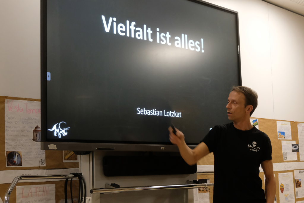 Ein Science-Slammer präsentiert Wissenschaft in einem modernen Gewand. Beim Science-Slam verwandeln sich „normale“ Wissenschaftler in Slammer. In einer fulminanten Atmosphäre präsentieren sie auf unterhaltsame Art die wissenschaftlichen Ergebnisse ihrer Forschungen und treten dabei in einer Art Wettbewerb gegeneinander an. Das Publikum entscheidet dann, wem es am besten gelungen ist, Unterhaltung und Erkenntnisgewinn zu vereinen. Lotzkat hob in seinem unterhaltsamen Vortrag „Vielfalt ist alles“ hervor, dass das was die Evolution in Milliarden von Jahren hervorgebracht hatte, nämlich eine ungeheure Artenvielfalt in sich ständig weiterentwickelnden Lebensräumen. In den wenigen Jahrtausenden kultureller Evolution droht diese nun von einer einzelnen Spezies, dem sogenannten Homo sapiens, zerstört zu werden.