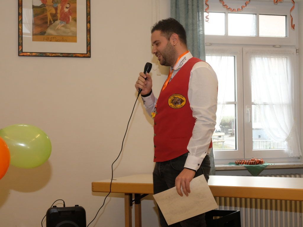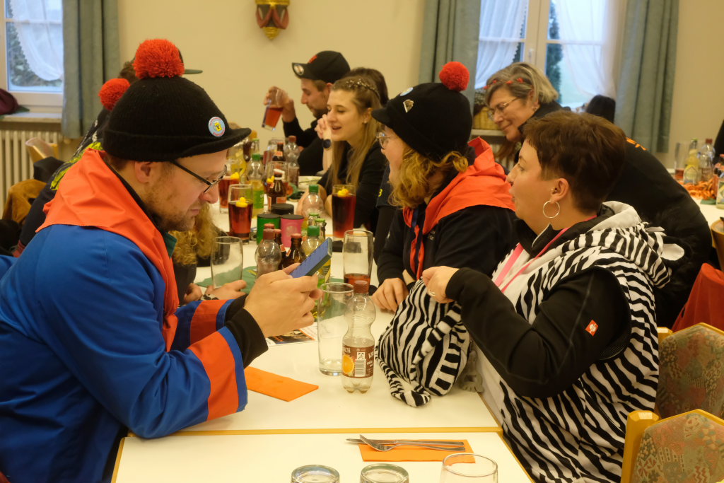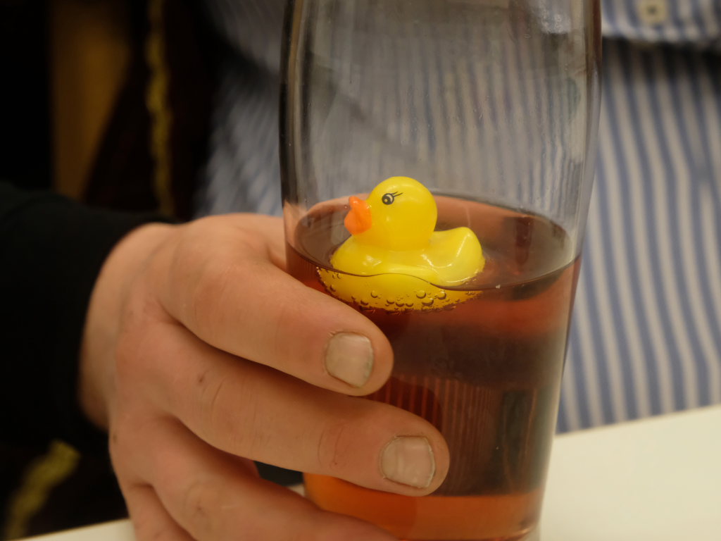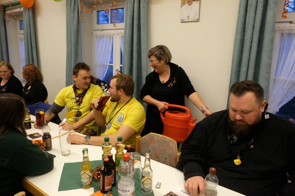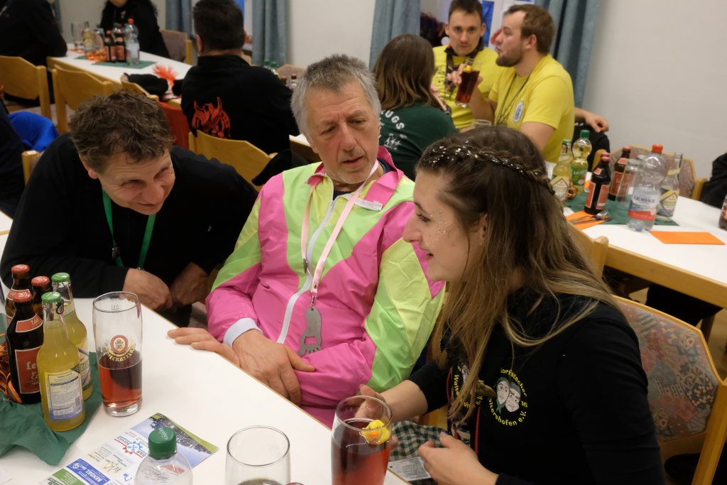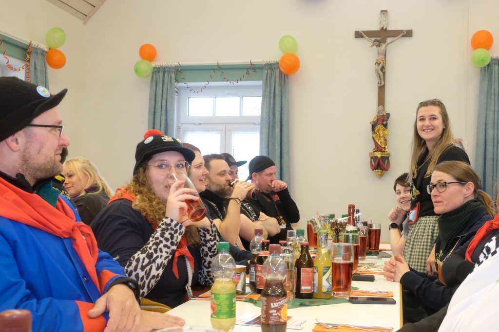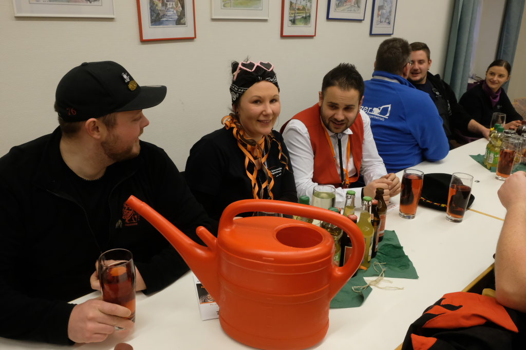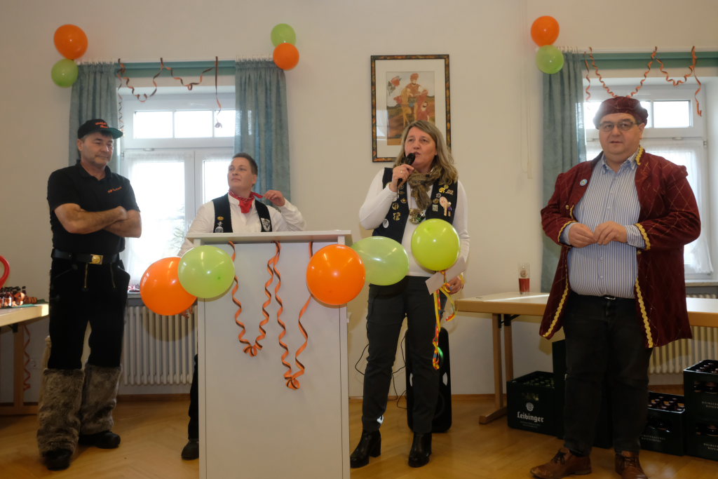 Doch auch sonst war vieles anders: Denn die einzelnen Zünfte wurden nicht nach dem Ablaufplan des Sprunges aufgerufen. Die Zunftmeisterin erklärte die Modalitäten, wie das Ganze ablaufen sollte. In einem großen Pool – einer Plastikbox – „schwammen“ viele kleine gelbe Entlein mit den Narrensprüchen der einzelnen Zünfte. Die ersten drei dieser Lotterie zogen Veser und ihre Vize Bodenmüller selbst – als Belohnung für die „Mühen“ durften diese, nachdem sie die nächsten gezogen hatten, mit diesen dann sich einen „Kurzen“ einverleiben und praktisch den Staffelstab dann an diese weitereichen. Auf diese Weise blieb die Aufmerksamkeit dem Geschehen am Rednerpult erhalten, denn keiner wusste somit, wann er dran war.