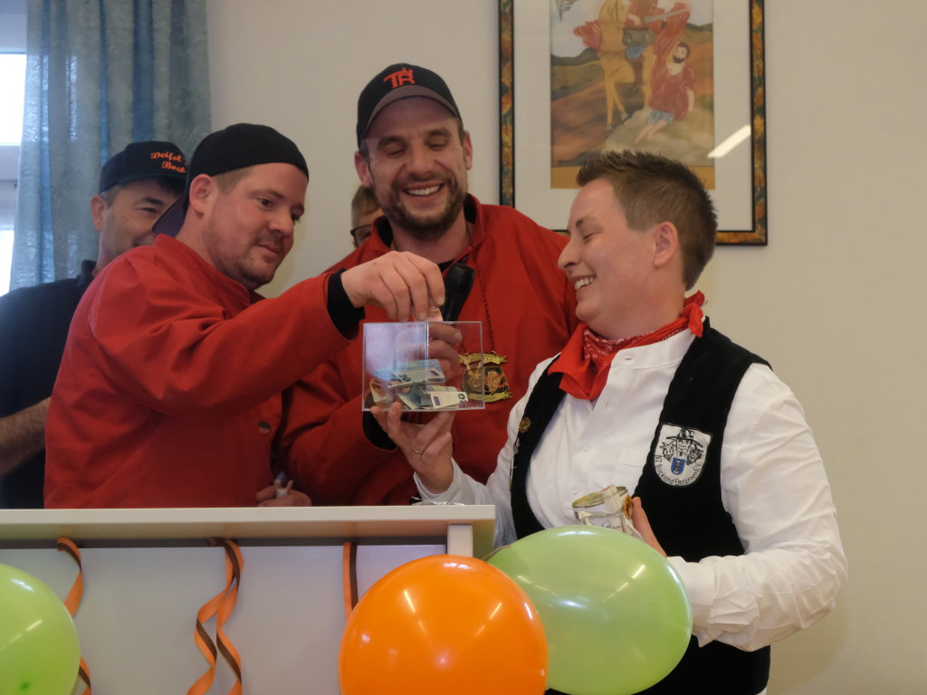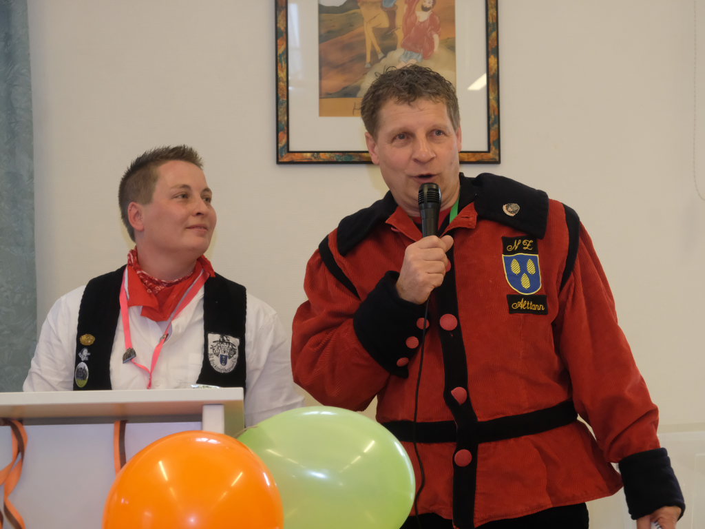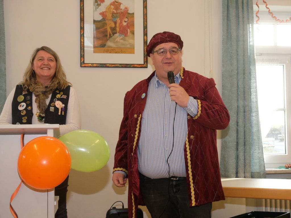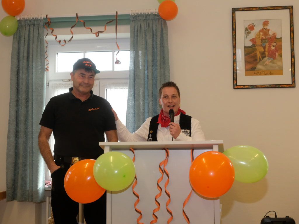Gemeinsam mit ihrem Vize Ewald Bodenmüller konnte sie pünktlich um 14.30 Uhr die Vertreter der anderen Zünfte begrüßen. Sie erklärte gleich zu Beginn die Modalitäten für diesen speziellen Empfang. Wie die Narrenzunft bereits in der Einladung geschrieben hatte, wollte sie, dass die Zunftmeister auf Gastgeschenke verzichten sollten. Stattdessen wurde die Zunftmeisterin trotz aller lockerer Stimmung kurz ganz ernst: Lieber sollten großzügige Spenden für die Aktion „Lichtblick für Familien“ in Wangen gegeben werden. Ein Obolus werde auch fällig, wenn einer der Redner anfange, über Banalitäten wie das Wetter zu quatschen oder sich für die Einladung zu bedanken. Der Aufruf erbrachte eine Saalspende in Höhe von 611,70 €.