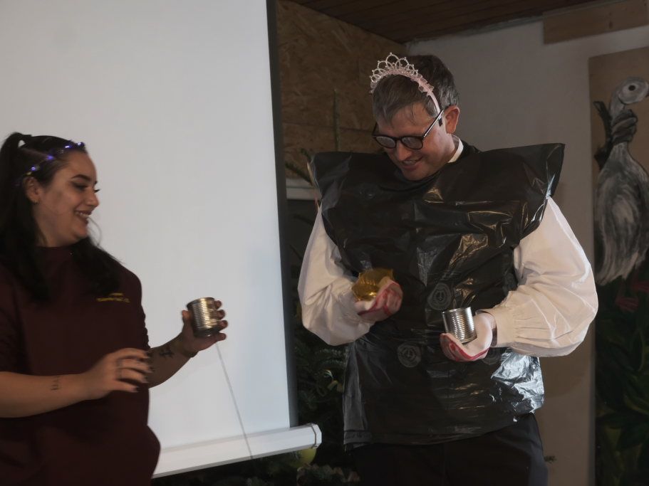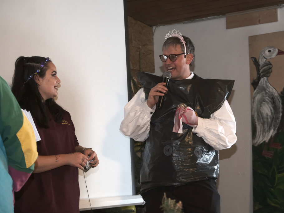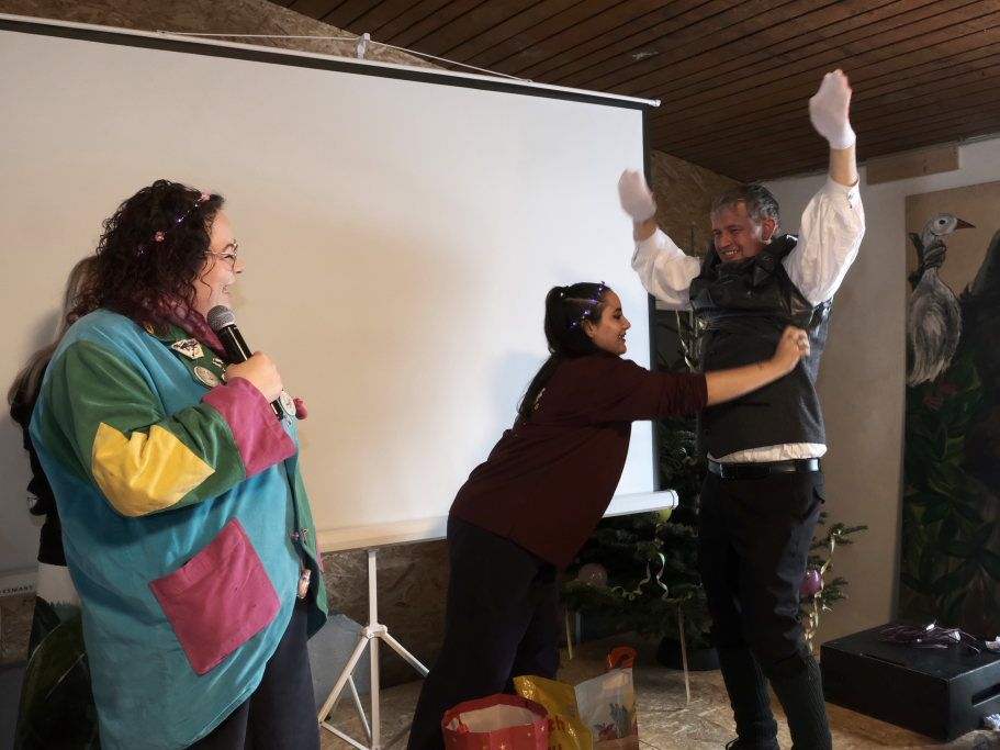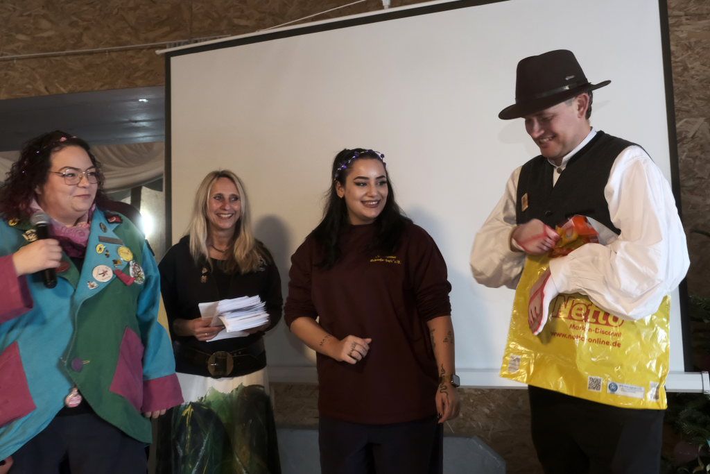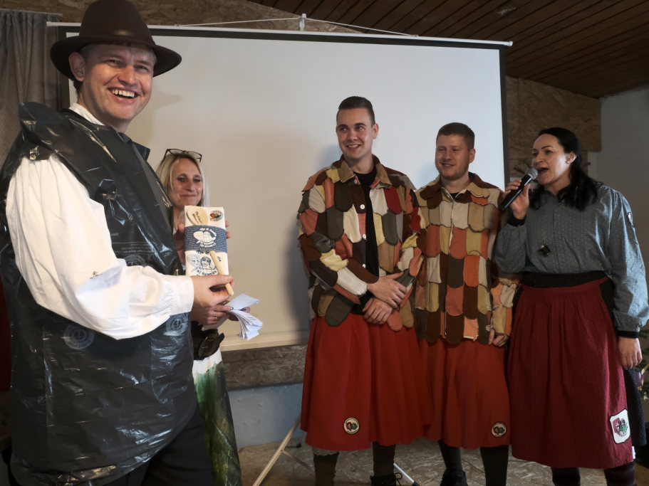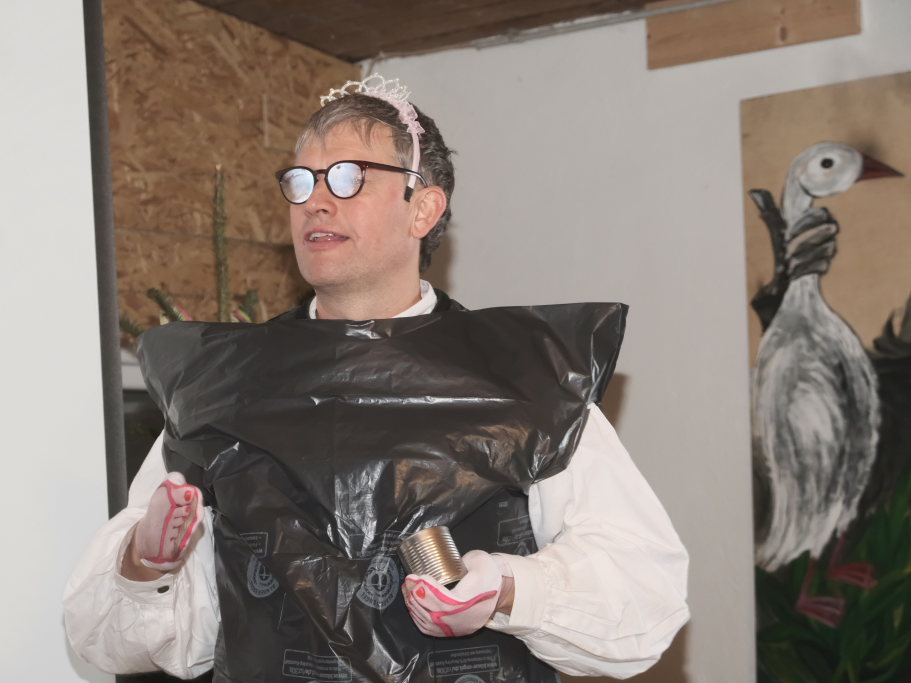 Die Mädels der Hoigamer Stroßa Hup´r vervollständigten die Ausrüstung des Wandersmannes und legten bei Willi Bu und seinem Häs kräftig Hand an: Als Regencape diente eine Mülltüte, eine Tüte einer Supermarktkette, die mit dem Slogan wirbt „Dann geh doch zu…“ mutierte zum Rucksack, Badelatschen wurden zu Wanderschuhen, die Sonnenbrille bestand aus einer Lesebrille, deren dicke Gläser mit einer Creme eingefärbt wurden. Bei den schicken Söckchen wurde Willi Bu zum Vierbeiner, denn diese trug er als Handschuhe. Um sich zu artikulieren, fungierten zwei Blechdosen als Handy.