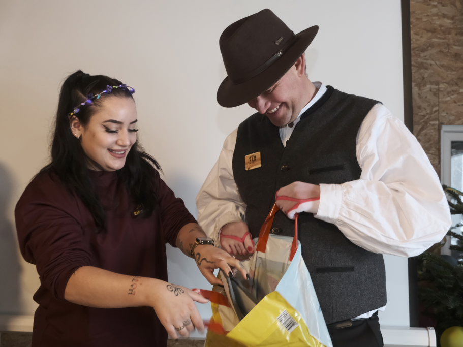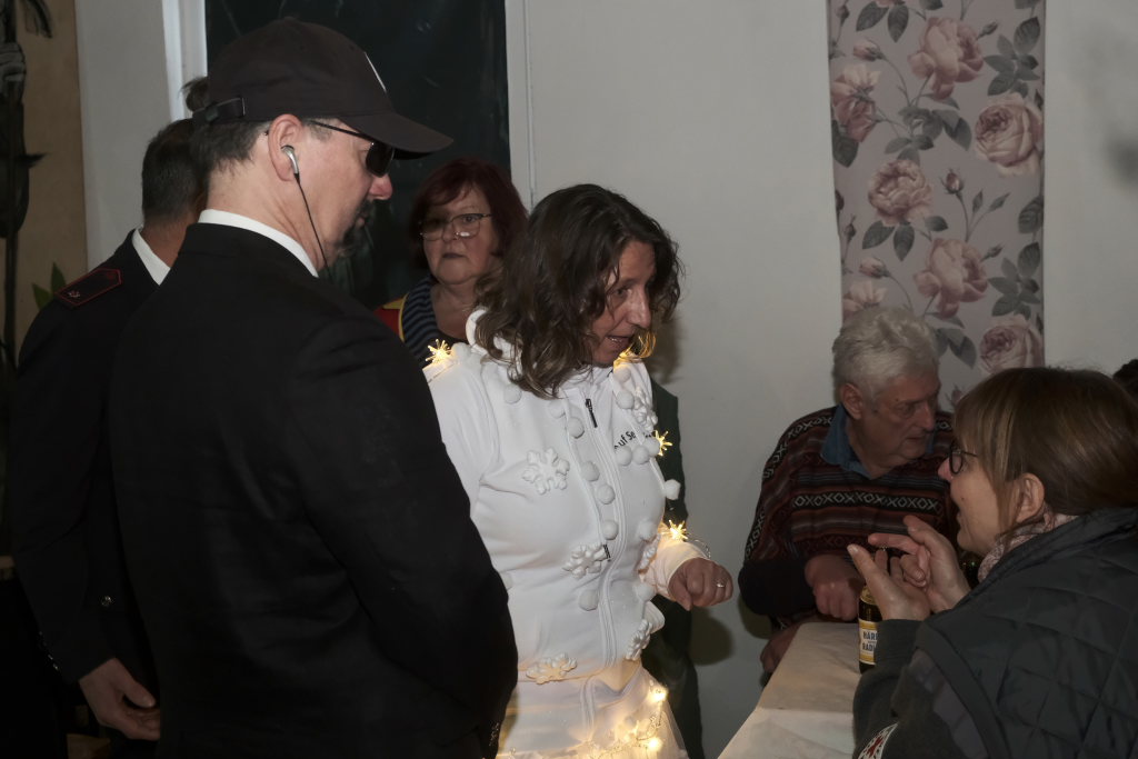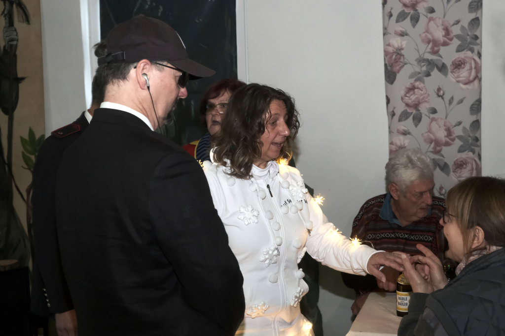 Viele Zünfte, unter anderem die Aitracher und Wurzacher, spenden inzwischen das Geld für Gastgeschenke lieber für einen guten Zweck und bringen nur noch Kleinigkeiten zu den Empfängen. In Seibranz erhielten die Zunftvertreter ebenso wie die Gäste wie Ortsvorsteherin Petra Greiner, die als fragile, aber leuchtende Schneeflocke gleich mal als Security ihren Gatten dabei hatte, oder Bürgermeisterin Alexandra Scherer oder die Feuerwehrleute, die während des Umzuges für die Straßenabsperrung sorgten, erhielten kleine Schnapsbecherlein mit Namensaufdruck anstelle des sonst üblichen Pins.
