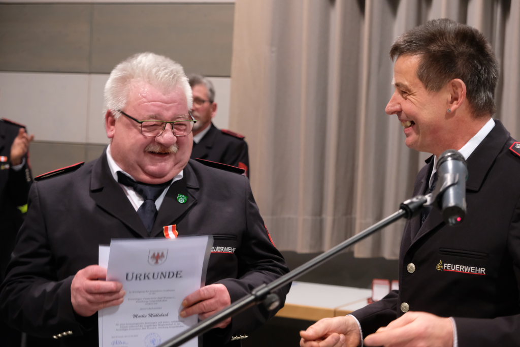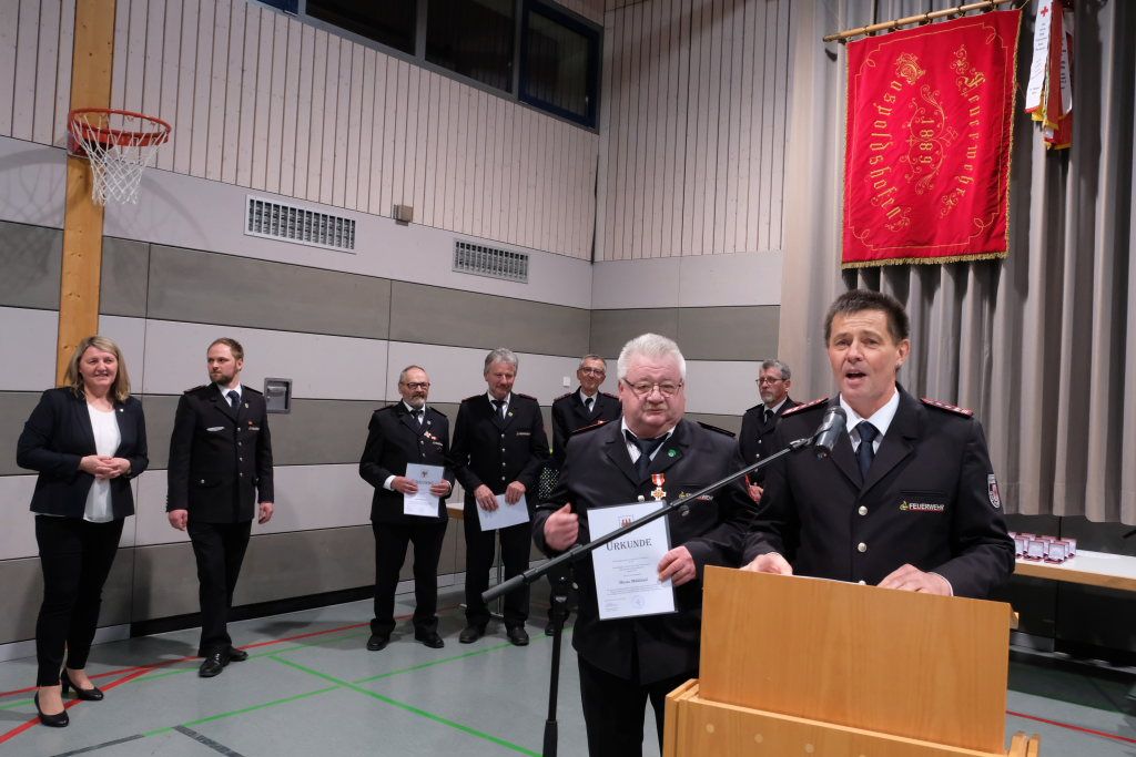 Eine ganz besondere Ehre zuteil wurde Martin Mühlebach aus Gospoldshofen, der von seinen 46 Dienstjahren über 40 Jahre Gerätewart für die Abteilung Gospoldshofen war. Er wurde unter dem stehenden Applaus der gesamten Versammlung vor seinem Ausscheiden aus dem aktiven Dienst und dem Übertritt in die Altersabteilung zum Ehrenmitglied ernannt.