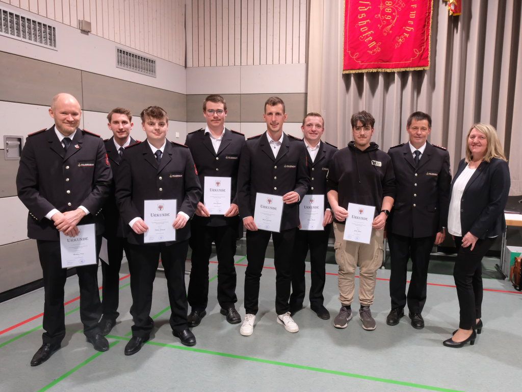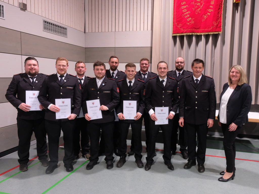 Zum Oberfeuerwehrmann bzw. –Frau befördert wurden: Nikolaus Schöllhorn und Moritz Dick, Arnach; Felix Maucher und Simon Traub, Eintürnen; Wolfgang Mayer, Thomas Butscher und Armin Litke, Ziegelbach; Philipp Mall, Dietmanns; Fabio Biancavallo, Lutz Schütt, Valentin Lacher, Ruth Dorsch und Felix Dorsch, alle Abteilung Stadt;