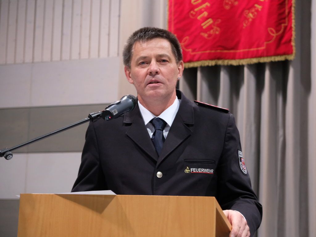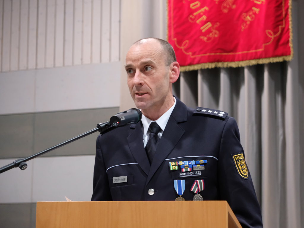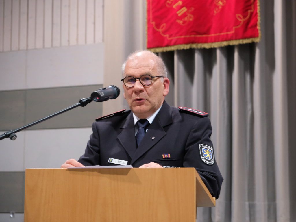 Achim Staudenmaier, Leiter des Polizeireviers Leutkirch, zollte in seinem Grußwort allen Geehrten großen Respekt und sagte auch, dass die Jahreshauptversammlung dafür der richtige Rahmen sei. Er lobte die hervorragende und vertrauensvolle Zusammenarbeit in Zeiten von Unmoral und Lüge. Es seien Zeiten mit großen Herausforderungen. So müssten wegen der besonderen Anforderungen bei Unfällen mit E-Autos die Feuerwehrleute entsprechende Schulungen absolvieren. Auch die Polizei sei in vielem auf die Mithilfe der Bevölkerung und natürlich der Feuerwehr angewiesen.