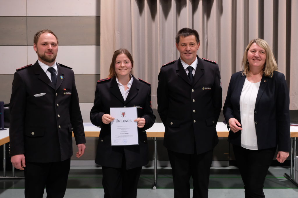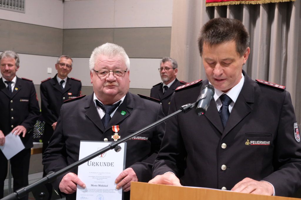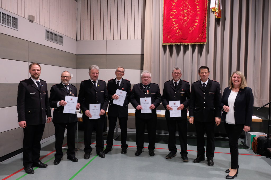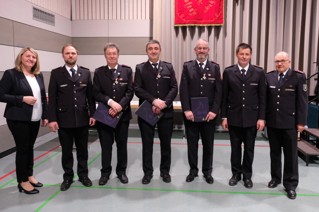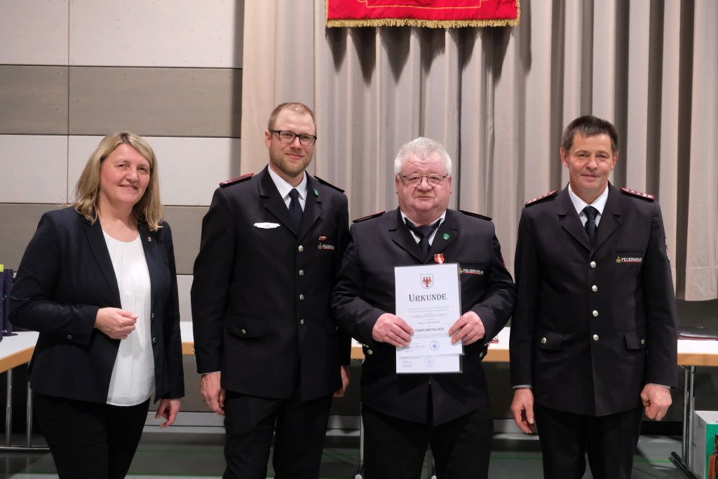 Bei den Ehrungen, bei denen die Ehrenzeichen in Bronze, Silber und Gold vergeben wurden, stieß der stellvertretende Kreisverbandsvorsitzende Alois Burkhardt zu Bürgermeisterin Scherer, Kommandant Rolf Butscher und dessen Stellvertreter Frank Weishaupt. Er übernahm dabei das Verlesen der Urkunden.