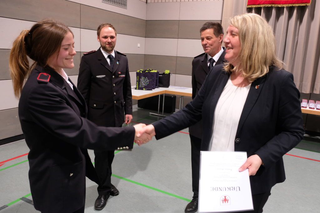 Bürgermeisterin Alexandra Scherer, die gemeinsam mit Rolf Butscher und dessen Stellvertreter Frank Weishaupt die Beförderungen durchführte, bezeichnete die Feuerwehr als eine der wichtigsten Einrichtungen der Stadt. „Wir wissen ihren Einsatz zu schätzen.“ Das Hochwasser habe gezeigt, dass die Wehr Tag und Nacht bereit war, Einsatz zu bringen. Deswegen stelle man der Feuerwehr auch eine gute Ausstattung zur Verfügung, auch wenn die Beschaffung nach wie vor schwierig sei. Ein besonderes Lob ging an Kommandant Rolf Butscher, der der Stadt durch seinen Einsatz für den Schlauchwagen viel Geld gespart hatte.