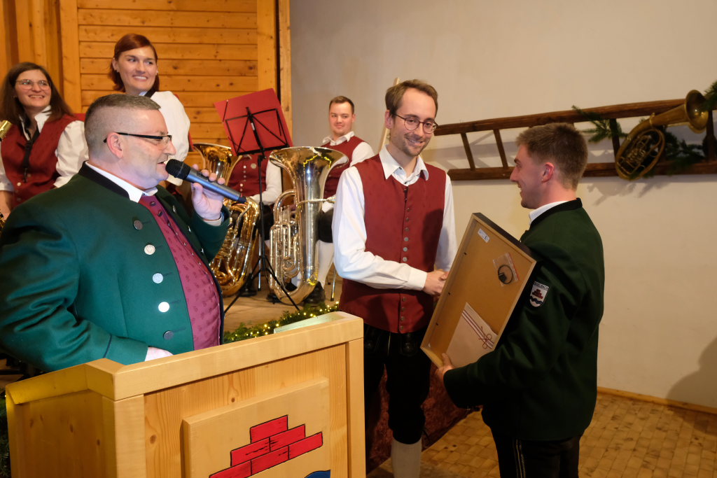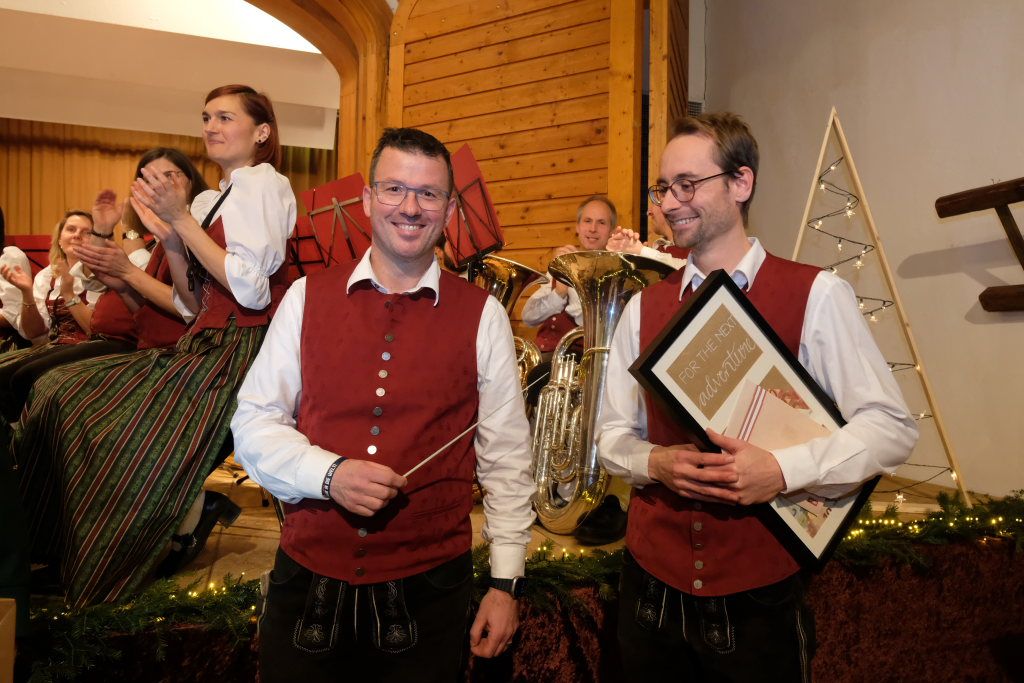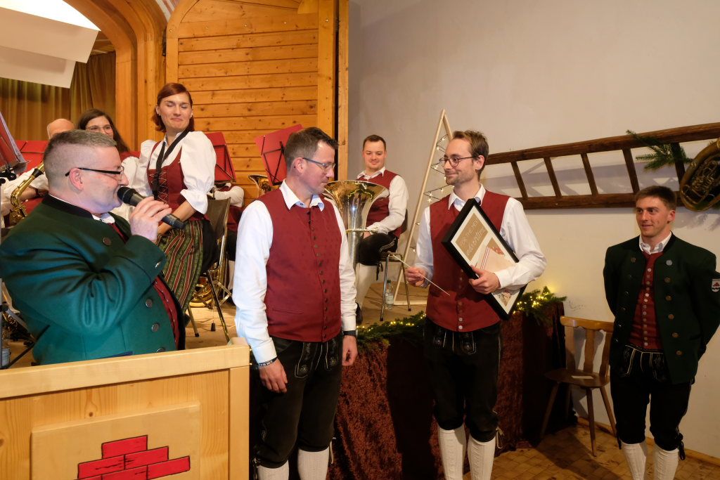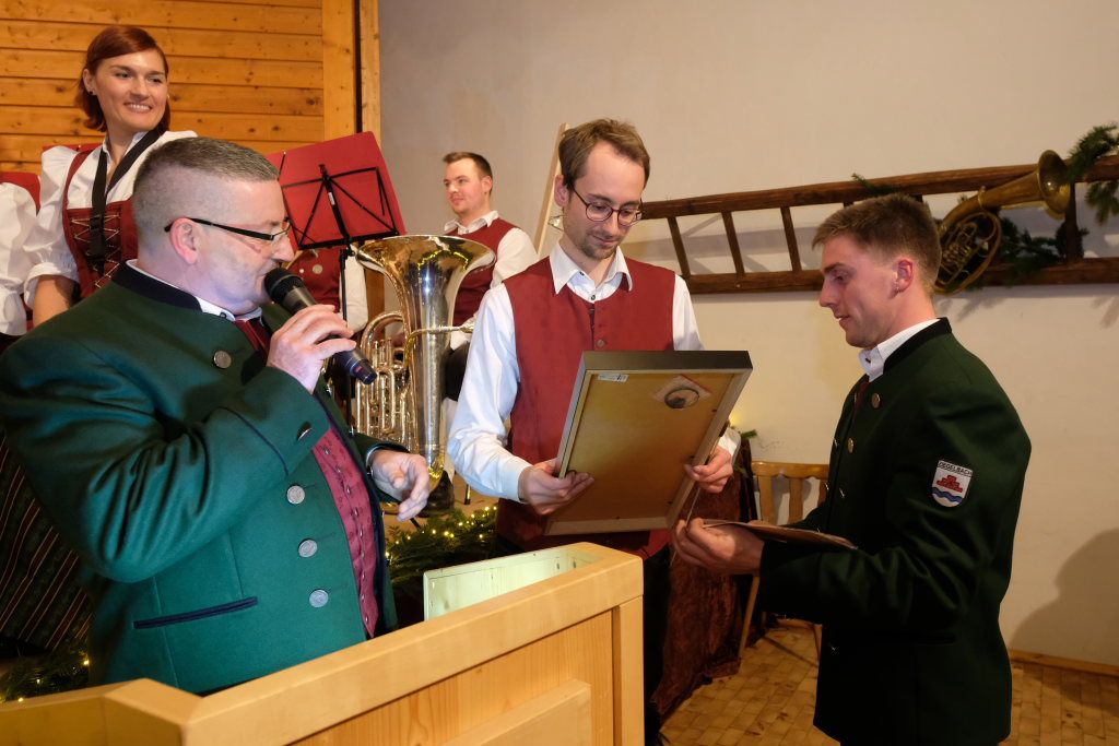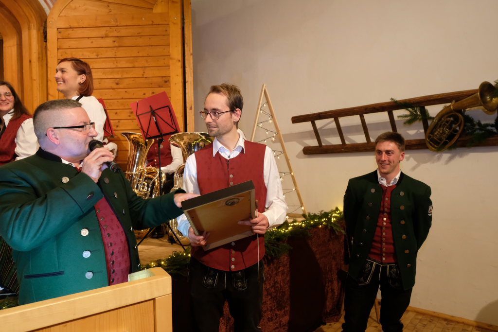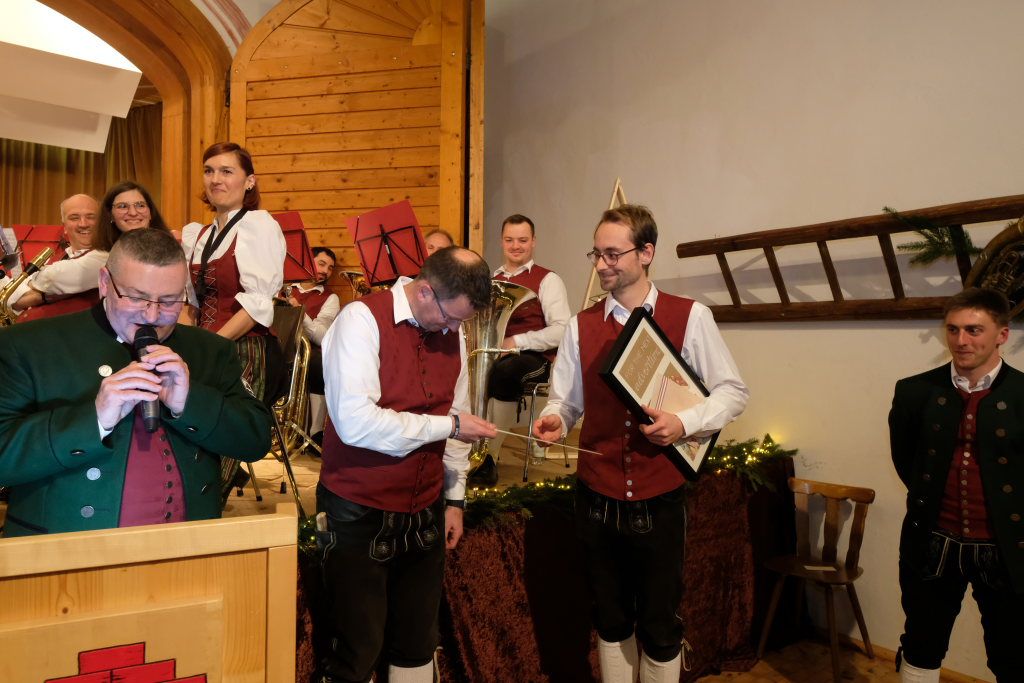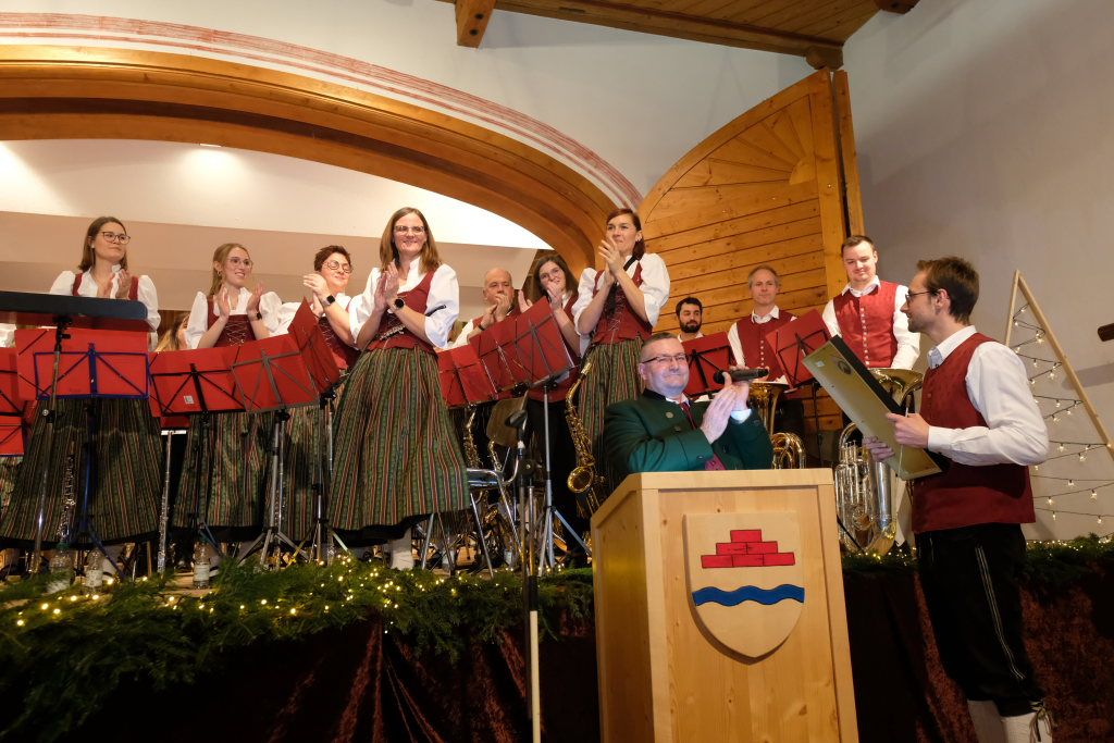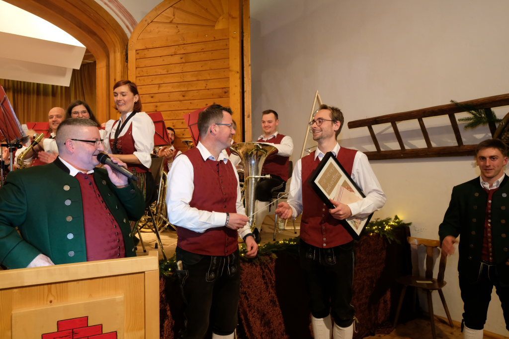 Oliver Herz wird von „seiner“ Musikkapelle mit Beifall und einem Geschenk als Dirigent verabschiedet. Als Hornist macht er weiter.