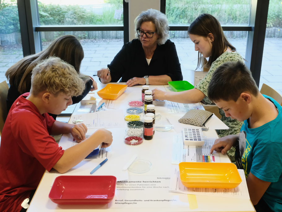 Die Karrierebegleiterin Hildegard Mühler mit Schülern bei der Station des Lageristen.
