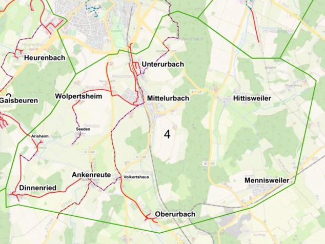 Bereich Mittelurbach. Die roten Linien stellen die Neubautrasse dar. Die Zahl nennt den Cluster.