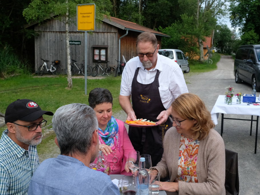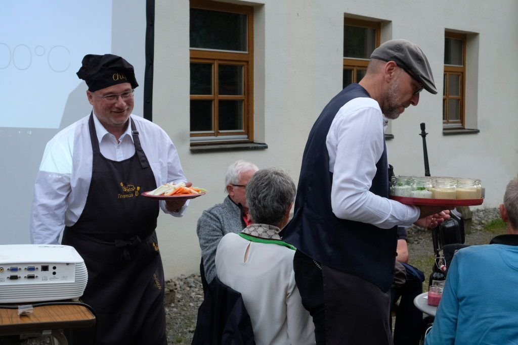 Der nächste Gang waren verschiedene Gemüse-Dips, dargereicht in Konservengläser natürlich aus der Herstellung von Verallia. Und wer könnte die Frage, wie die Glasfabrik am Ried entstanden ist, besser beantworten, als Karl-August Mohr, der dort selbst seit über 40 Jahren seine Brötchen verdient.