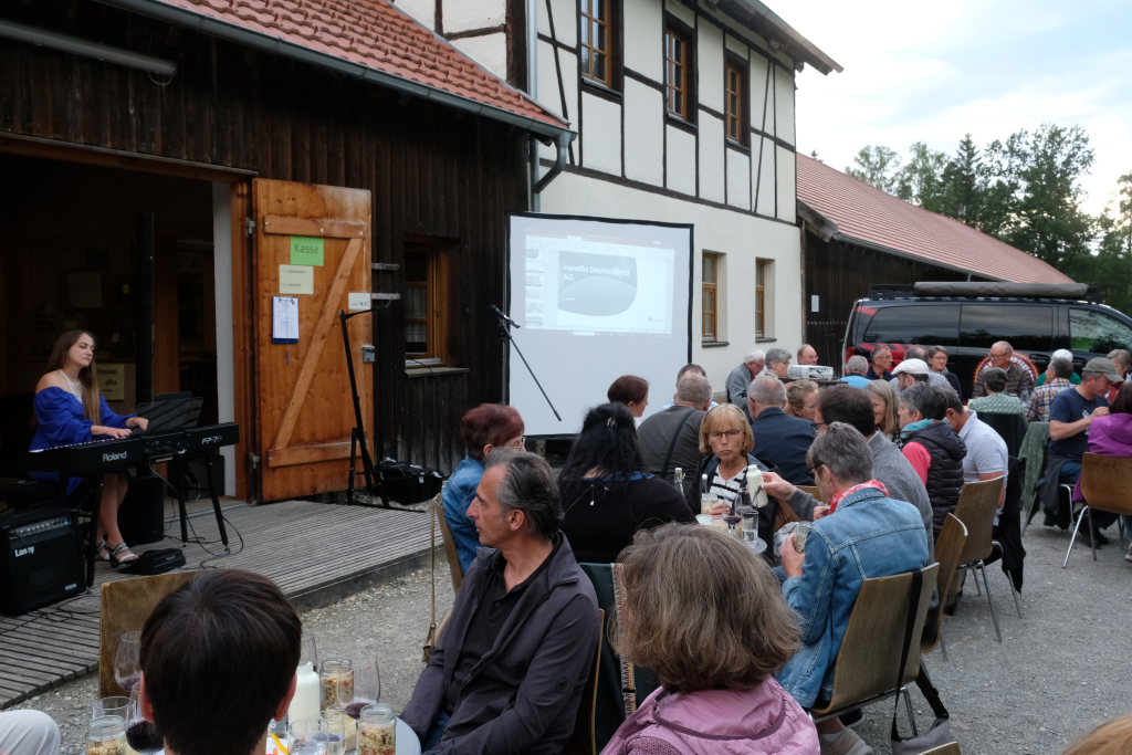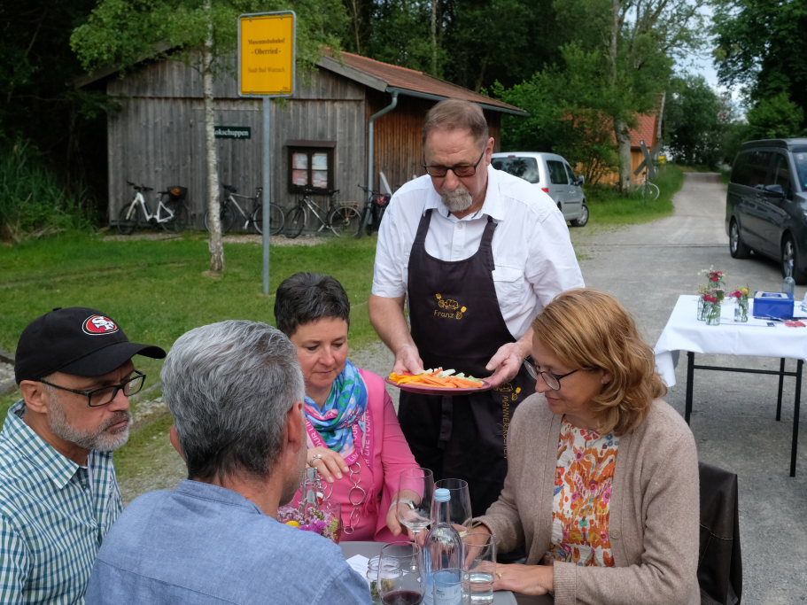 Brot & Wein ist eine Veranstaltungsreihe der Jugendseelsorge, der Seelsorgeeinheit Bad Waldsee und der Bauernschule Bad Waldsee. Bevor die rund 50 Teilnehmer an der Veranstaltung sich wegen des schönen Sommerabends vor dem Torfmuseum an den Tischen niederließen, bestand für sie noch die Möglichkeit, mit der Torfbahn zu fahren.