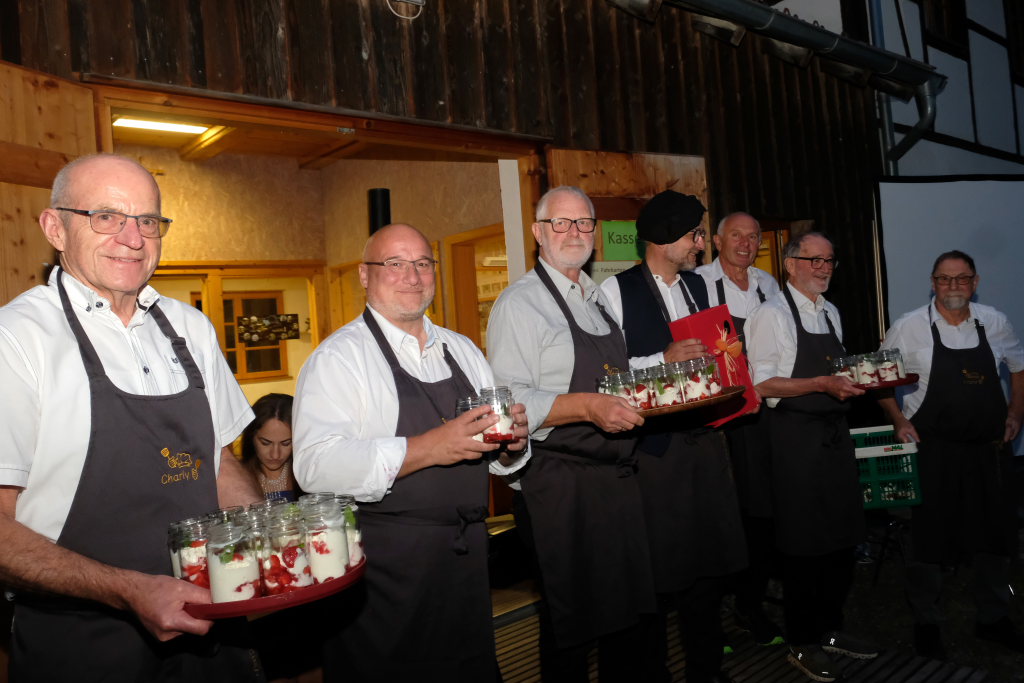 Die Männer des Männer-Kochens treffen sich übrigens an jedem zweiten Mittwoch des Monats um 19.00 Uhr im Pius-Scheel-Haus und sind offen für neue Gesichter und Ideen. Matthias Winstel berichtete auch, wie die Menü-Ideen beim Männerkochen entstehen. So kam die Idee für das Hauptgericht von Thomas Grandl, der das Rezept zum Hauptgang Kritharaki (griechischer Nudelreis mit Gemüse mit oder ohne Hackfleisch) aus dem Urlaub mitgebracht hatte. Der jeweilige Ideengeber ist dann für den Einkauf und die Organisation zuständig und darf dafür auch die Chef-Kochmütze tragen. Natürlich wurde auch das Hauptgericht in einem Konservenglas von Verallia kredenzt, ebenso wie das Dessert Erdbeerquark im Glas, welches das wunderbare Gericht sehr schön abrundete.