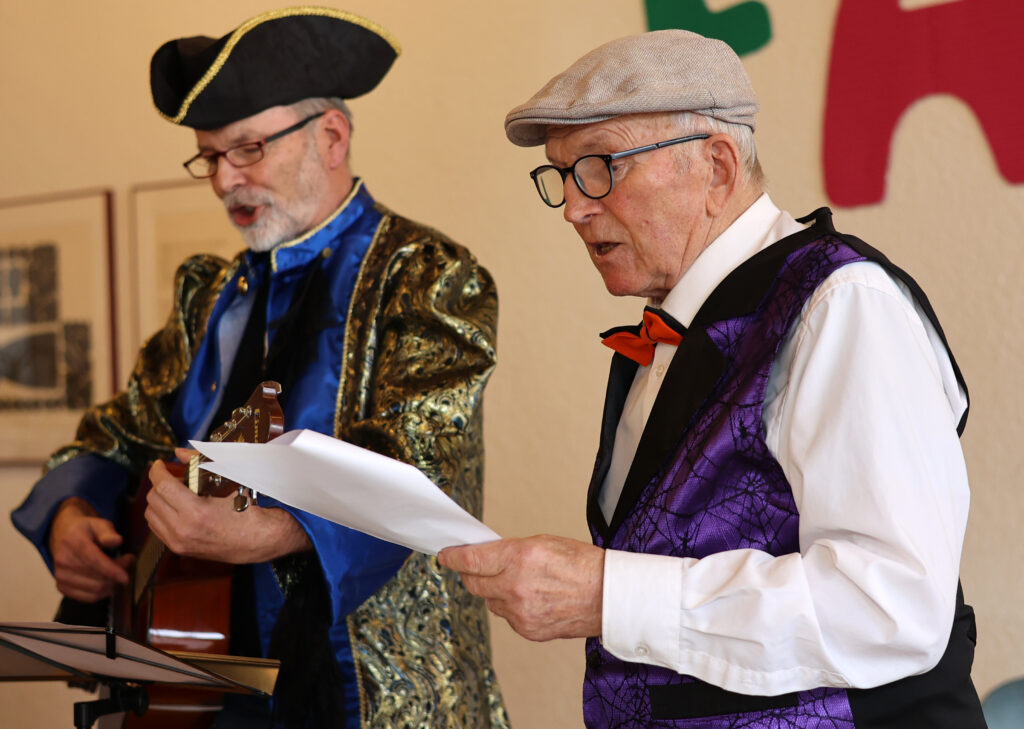 Ein Highlight des Nachmittags war die amüsante Erzählung von Rita, die mit ihrer Geschichte über ihr Hundele die Herzen der Zuhörer eroberte. Auch Hermann und Hansjörg Schick sorgten mit ihren humorvollen Reimen und Gesang für Lacher, als sie das Stadtgeschehen karikierten und sich mutig dem Thema des Turms widmeten. Ihre Bierserenade über die Brauereien in der Umgebung fand großen Anklang und die Genossenschaft des Kurhauses mit dem Torfstecher-Restaurant wurde von den beiden Sängern in den höchsten Tönen gelobt.