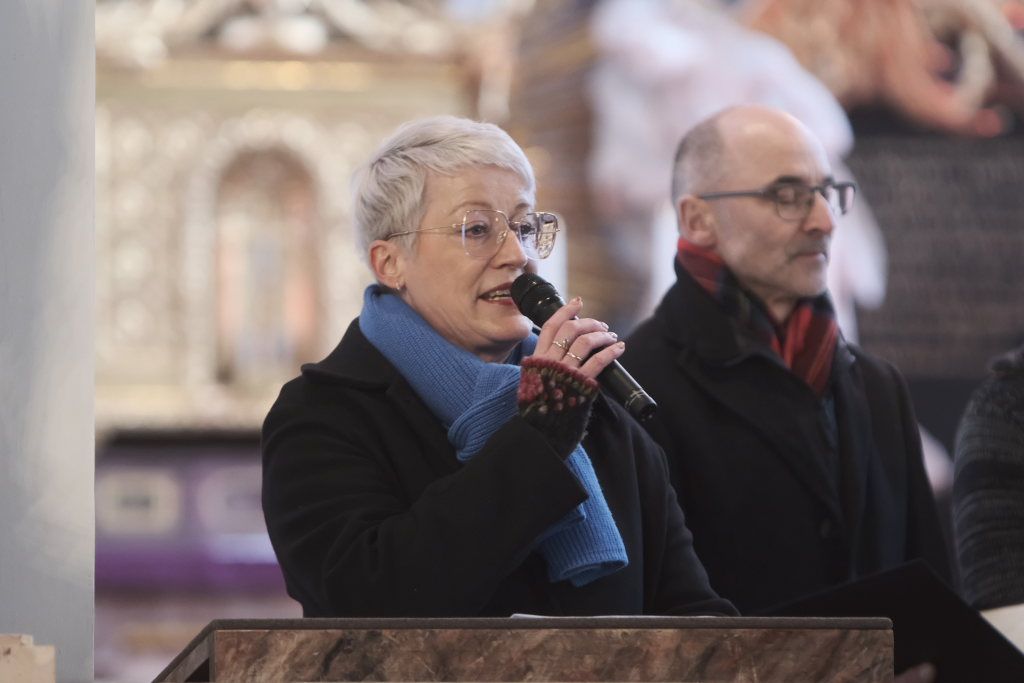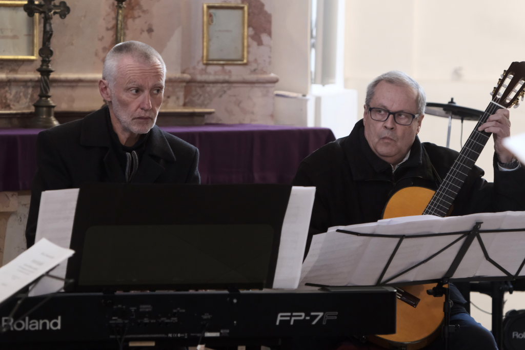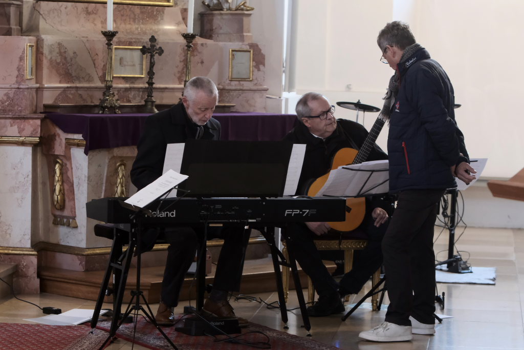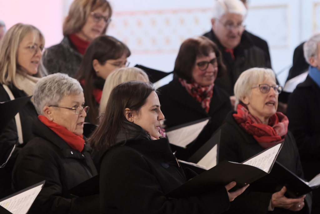 Dann wurde es rockig: Bei „Rocking around the christmas tree“ gab es noch einmal die volle Orchestrierung mit Siegfried Sgier am Schlagzeug, Rainer Uhl an der Gitarre und Robert Häusle am Piano. Hier durften die Besucher mitswingen. Bemerkenswert: Auch dieses Arrangement hatte Katja Ehrat „ihrem“ Chor auf den Leib geschrieben. Nach den Danksagungen an Musiker, Hausherr und Publikum durch Bettina Sgier und dem Hinweis auf die warmen Getränke und Gebäck, die im Haus Maria auf die Besucher warteten, gab es mit „Leise rieselt der Schnee“ eine Rückkehr in heimische Musikgefilde.