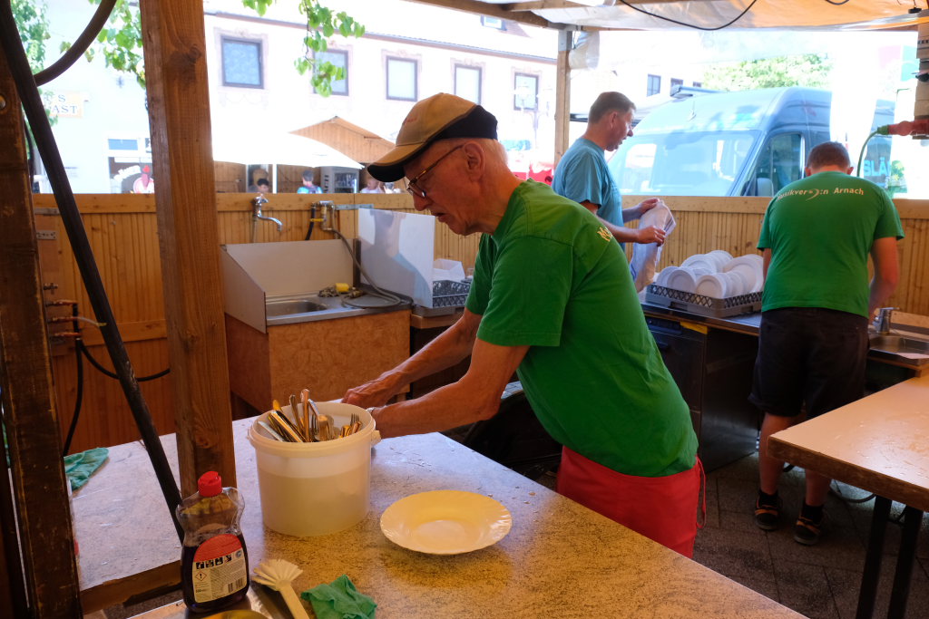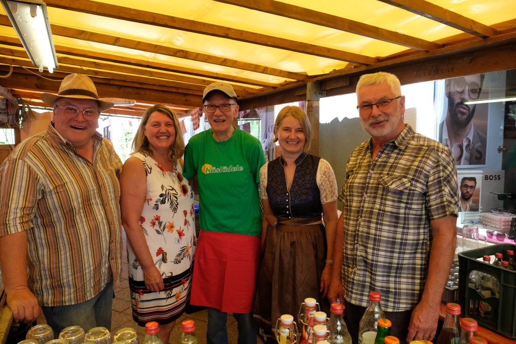 Einen ganz besonderen Besuch stattete Bürgermeisterin Alexandra Scherer, ihr ehrenamtlicher Stellvertreter Klaus Schütt, Gemeinderat Norbert Fesseler und die HGV-Vorsitzende Vincon-Westermayer der Hütte des Musikvereins Arnach ab. Waren schon allein die vorzüglich mundenden Käsespätzle ein Grund für den Besuch gewesen, hatte die Gruppe noch ein weiteres Ziel: Werkelte der in diesem Jahr schon vielfach geehrte Xare Miller doch dort seit vielen Jahren an der Spüle – und er tat dies auch an seinem 89. Geburtstag. Und so bekam der Unermüdliche als besonderes Geschenk von der prominenten Gruppe ein „Zum Geburtstag viel Glück“ geschmettert …