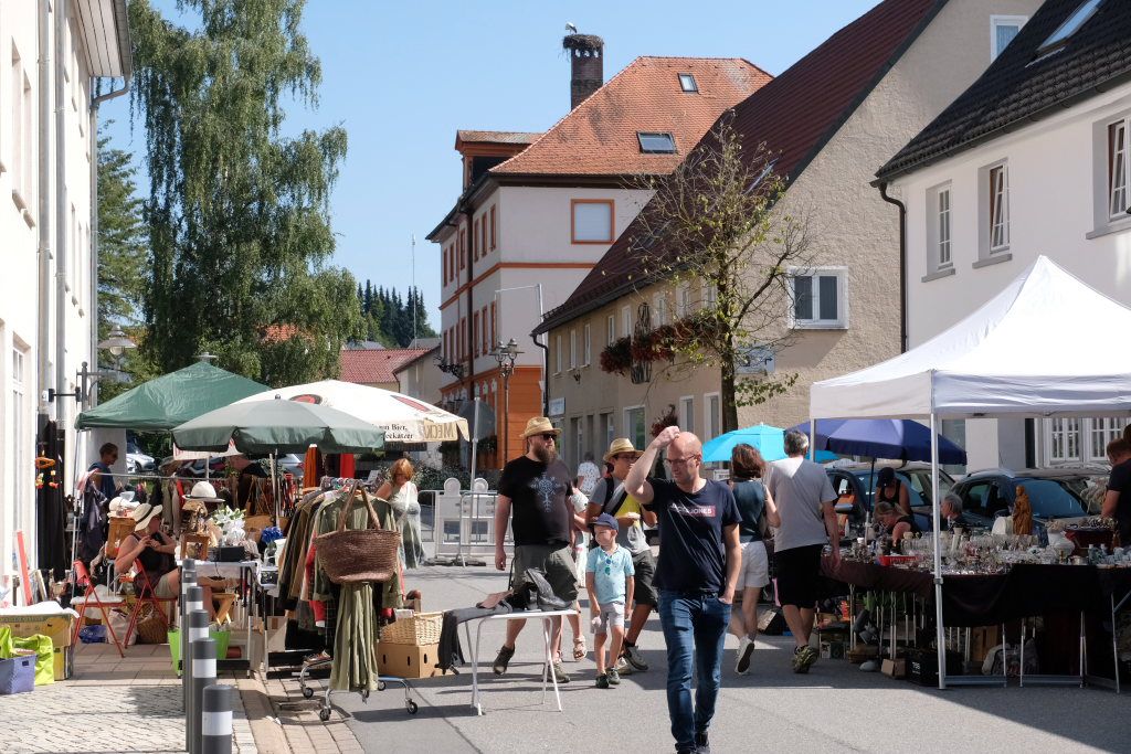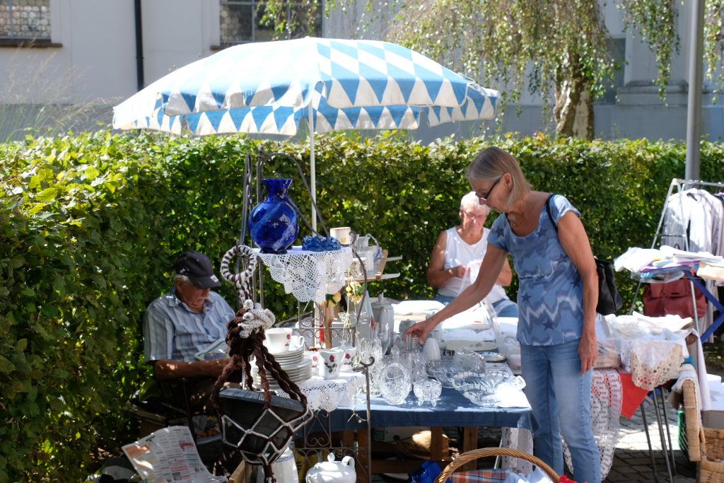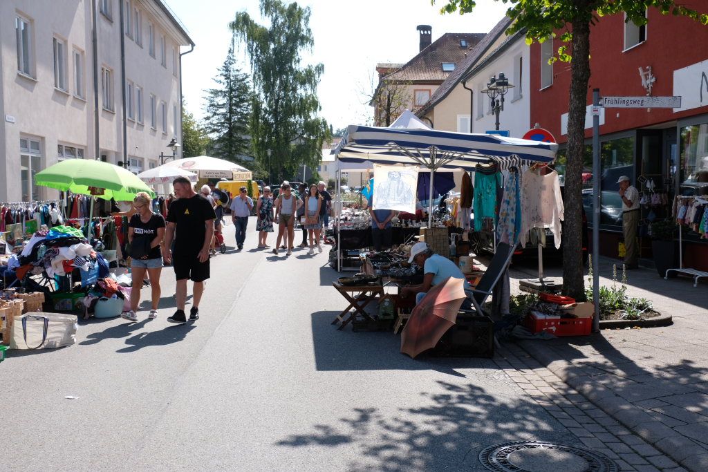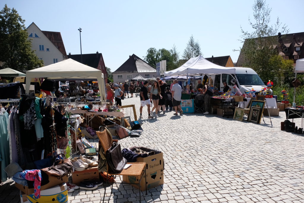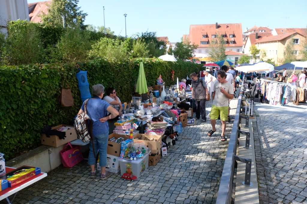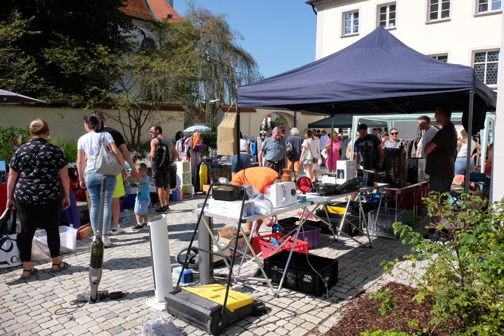 Schon früh am Morgen rumorte es beim Klosterplatz, auf der Marktstraße und im Innenhof des Schlosses, als die Flohmarktbeschicker und die Kinder ihre Stände aufstellten. Neu war in diesem Jahr, dass der Klosterplatz das Zentrum des Flohmarktes bildete, und die Stände sich von der Schul- über die Marktstraße zum Marienbrunnen zogen, ab wo dann die Buden und Hütten der Vereine bis zum Postplatz zum Verweilen einluden. Kinderschminken und der Rummelplatz mit Kinderkarussell und Geisterhalle und diversen Wurf -und Schießbuden waren in diesem Jahr vom Klosterplatz zum Bereich zwischen Amtshaus und Stadtwirtschaft gegenüber der Rathausbühne gewandert.