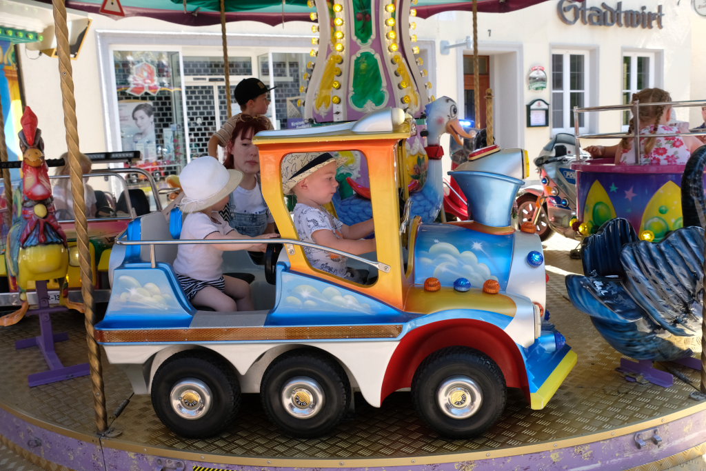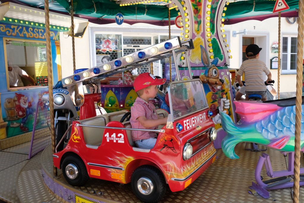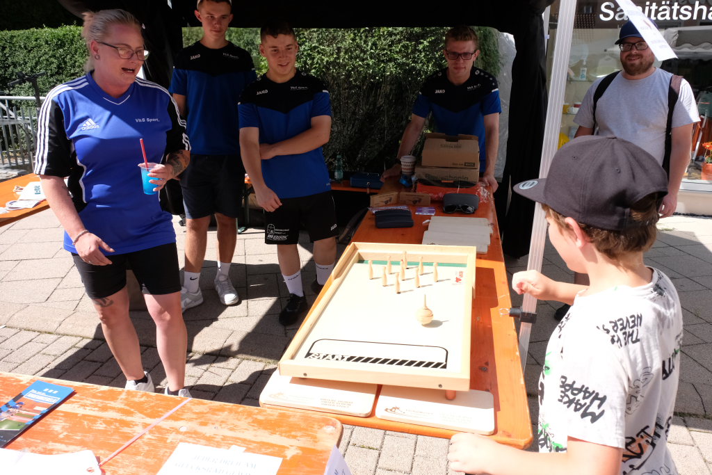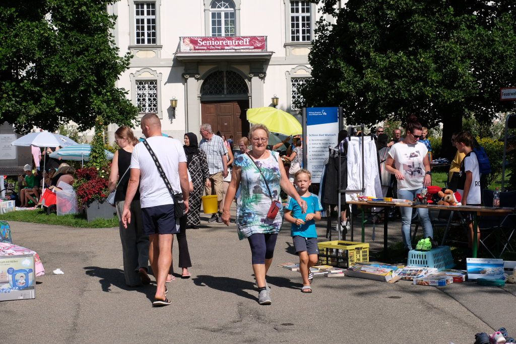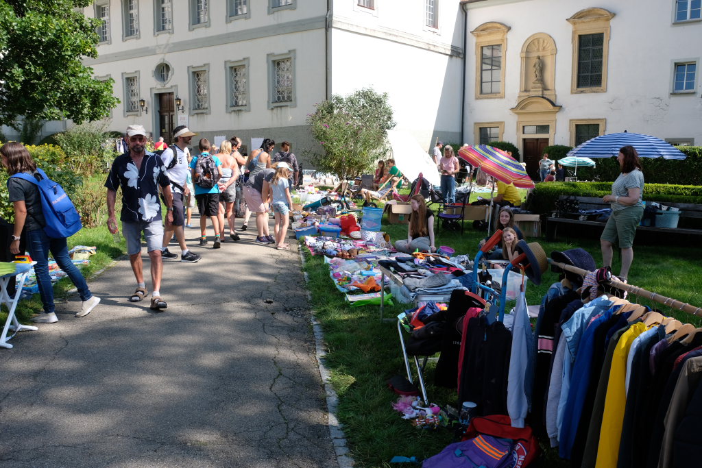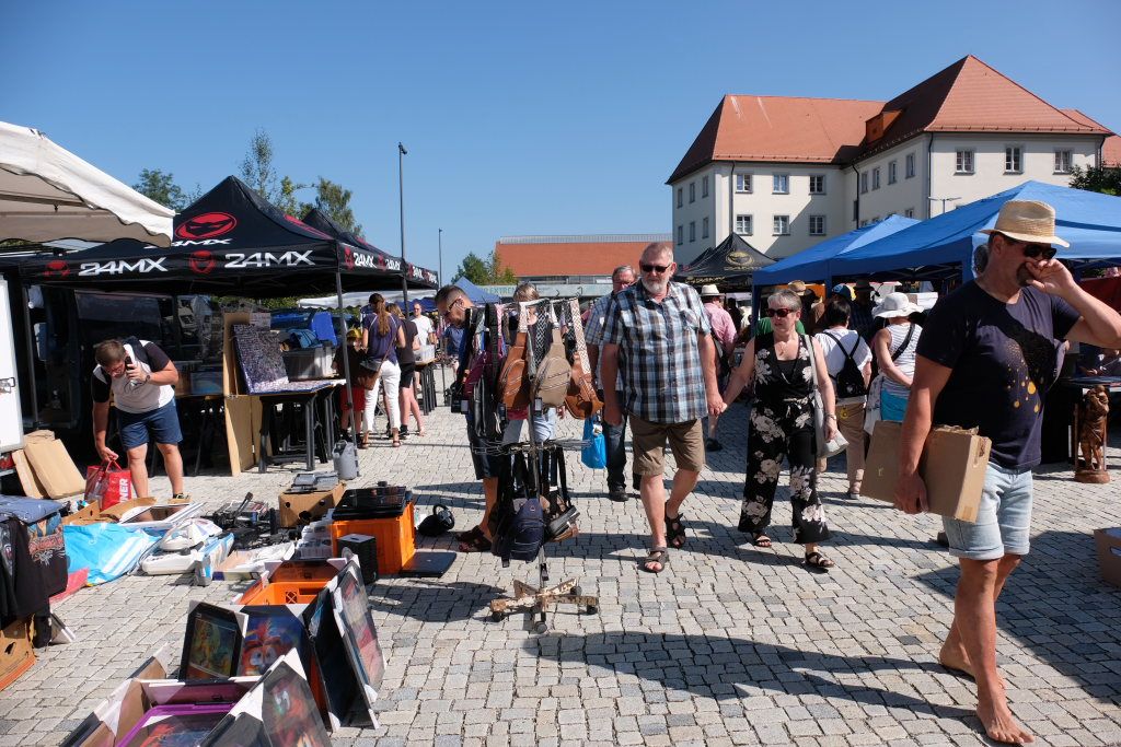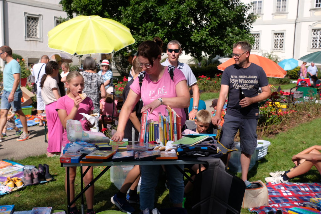 Schon früh am Morgen rumorte es beim Klosterplatz, auf der Marktstraße und im Innenhof des Schlosses, als die Flohmarktbeschicker und die Kinder ihre Stände aufstellten. Neu war in diesem Jahr, dass der Klosterplatz das Zentrum des Flohmarktes bildete, und die Stände sich von der Schul- über die Marktstraße zum Marienbrunnen zogen, ab wo dann die Buden und Hütten der Vereine bis zum Postplatz zum Verweilen einluden. Kinderschminken und der Rummelplatz mit Kinderkarussell und Geisterhalle und diversen Wurf -und Schießbuden waren in diesem Jahr vom Klosterplatz zum Bereich zwischen Amtshaus und Stadtwirtschaft gegenüber der Rathausbühne gewandert.