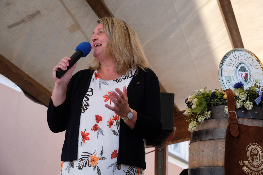 Christiane Vincon-Westermayer beim Fassanstich: Mit zwei Schlägen war’s getan