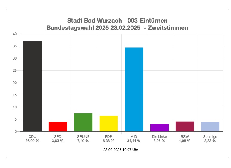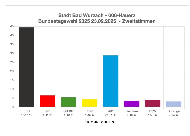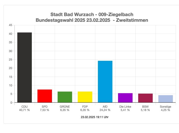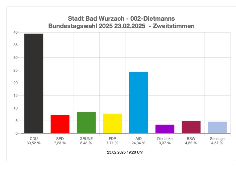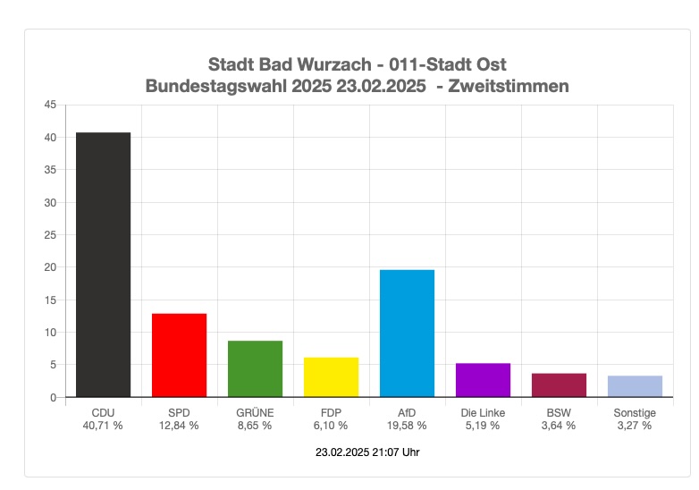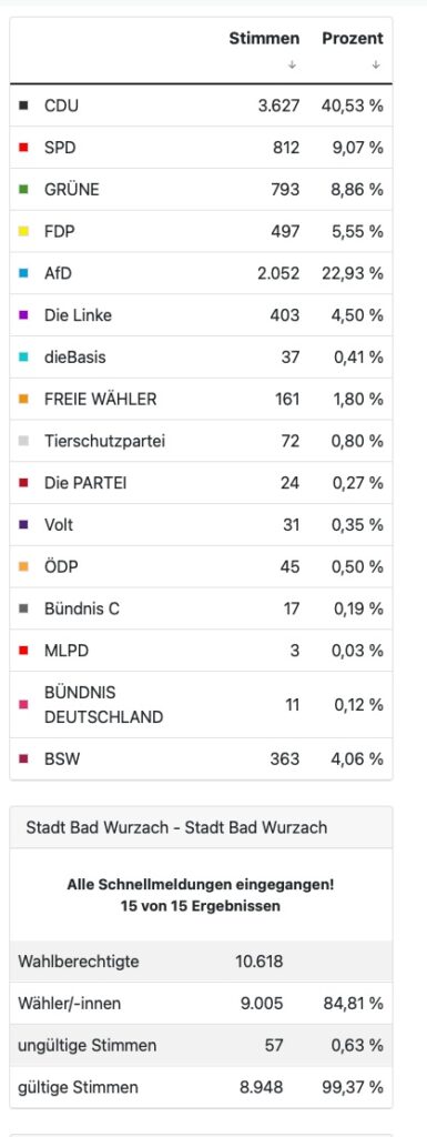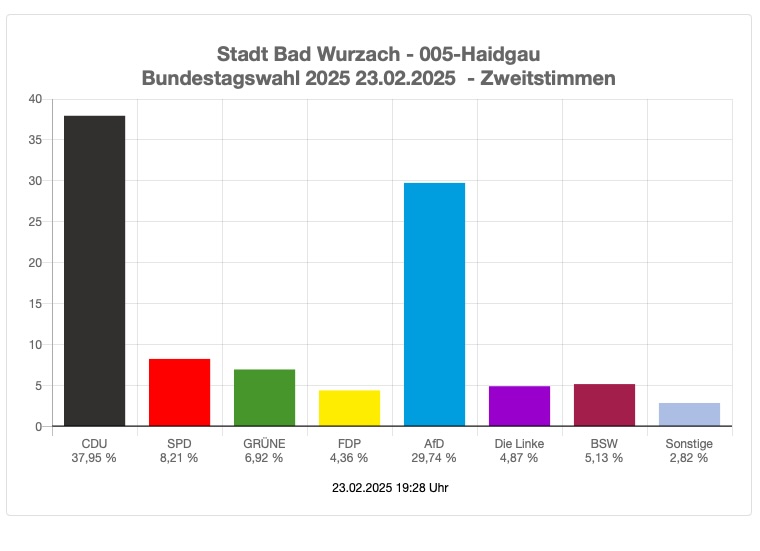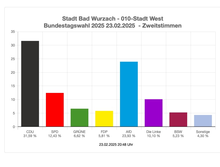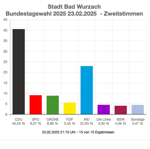 Bad Wurzach – CDU vor AfD und SPD und den Grünen: So lautet das Bundestagsergebnis in Bad Wurzach. Im Einzelnen: Die CDU holte in Bad Wurzach 40,5 Prozent der für die Sitzverteilung im Bundestag entscheidenden Zweitstimmen. Auf die AfD entfielen 22,9 Prozent, auf die SPD 9,1 Prozent, auf die Grünen 8,9 Prozent. Auf den weiteren Plätzen folgen: FDP mit 5,6 Prozent, die Linke mit 4,5 Prozent, das BSW mit 4,1 Prozent und Sonstige: 4,5 Prozent. (Homepage der Stadt um 21.10 Uhr).