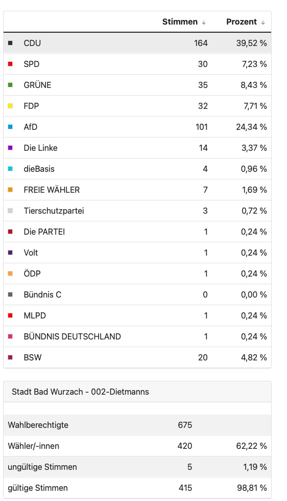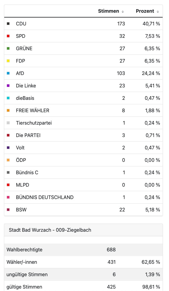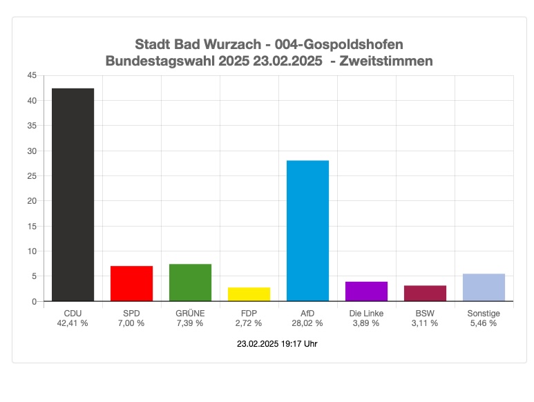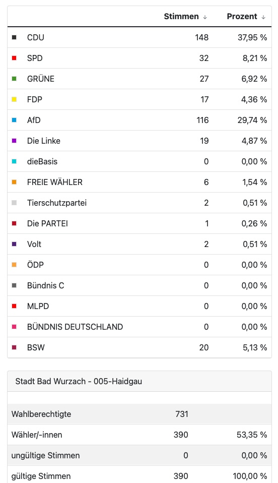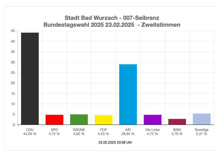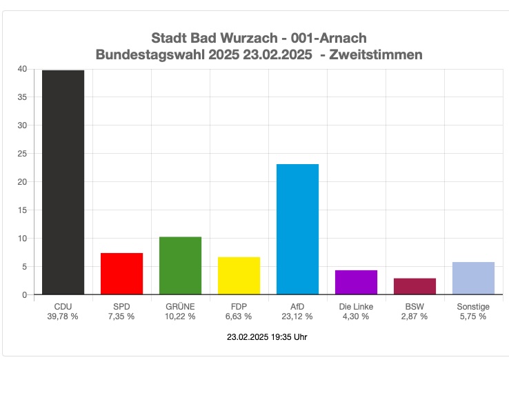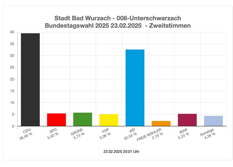Bad Wurzach – CDU vor AfD und SPD und den Grünen: So lautet das Bundestagsergebnis in Bad Wurzach. Im Einzelnen: Die CDU holte in Bad Wurzach 40,5 Prozent der für die Sitzverteilung im Bundestag entscheidenden Zweitstimmen. Auf die AfD entfielen 22,9 Prozent, auf die SPD 9,1 Prozent, auf die Grünen 8,9 Prozent. Auf den weiteren Plätzen folgen: FDP mit 5,6 Prozent, die Linke mit 4,5 Prozent, das BSW mit 4,1 Prozent und Sonstige: 4,5 Prozent. (Homepage der Stadt um 21.10 Uhr).