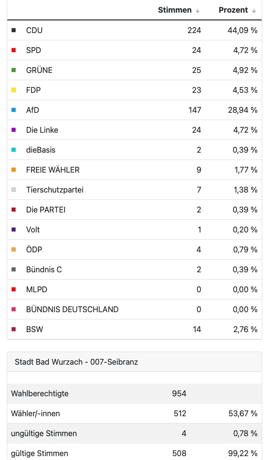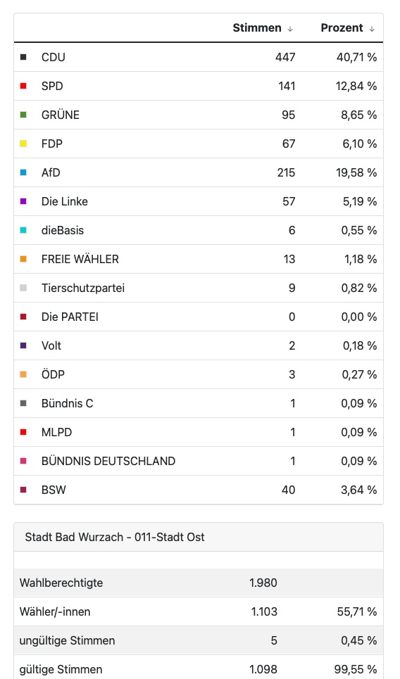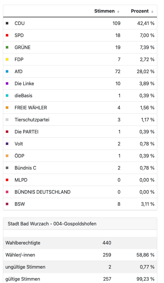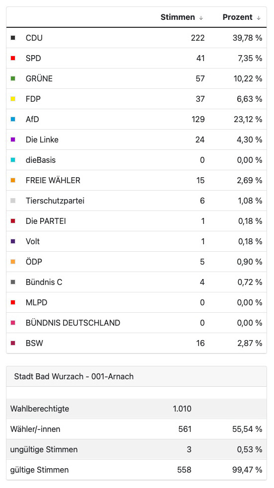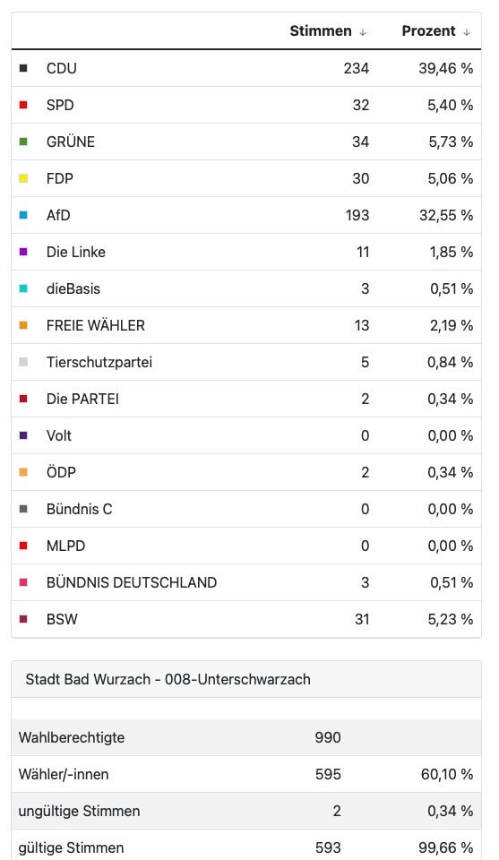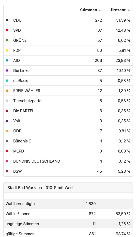 Bad Wurzach – Bad Wurzach gliedert sich in 11 Wahlbezirke: die 9 Ortschaften und die 2 Kernstadt-Wahlbezirke (dazu kommen 4 Briefwahlbezirke). Wir haben die Ergebnisse der 11 Präsenzwahlen der Webseite der Stadt Bad Wurzach entnommen – sowohl in grafischer als auch in tabellarischer Form. Achtung: In den Wahlbezirksergebnissen sind keine Briefwahlstimmen enthalten; lediglich im Bad Wurzacher Gesamtergebnis sind auch die Briefwahlstimmen drin!