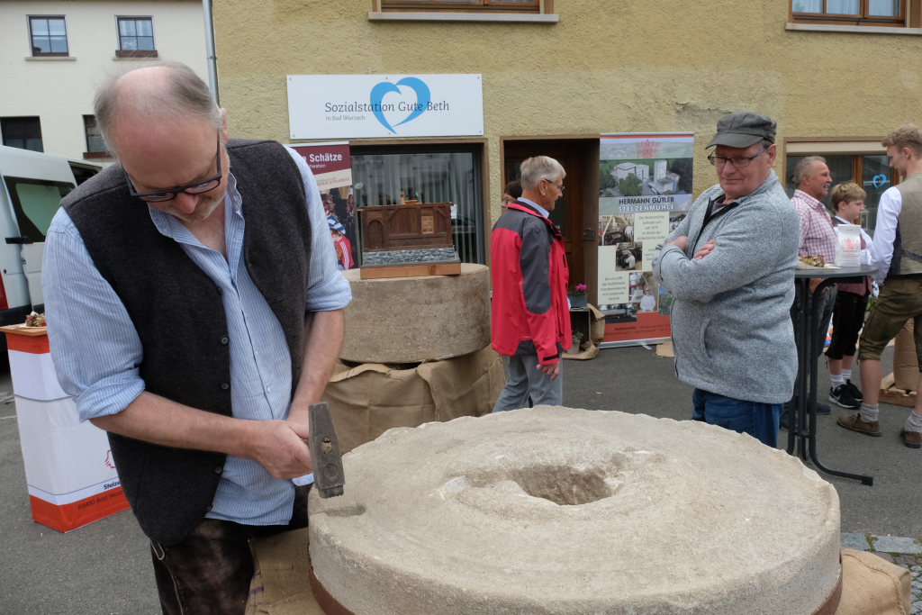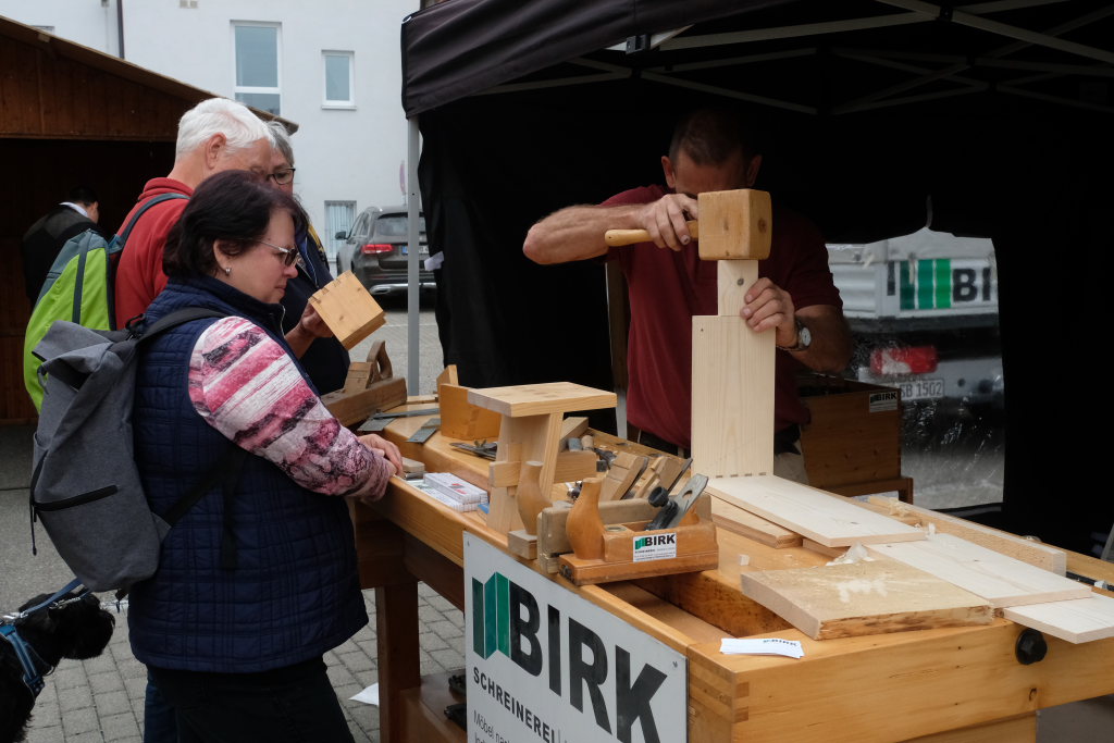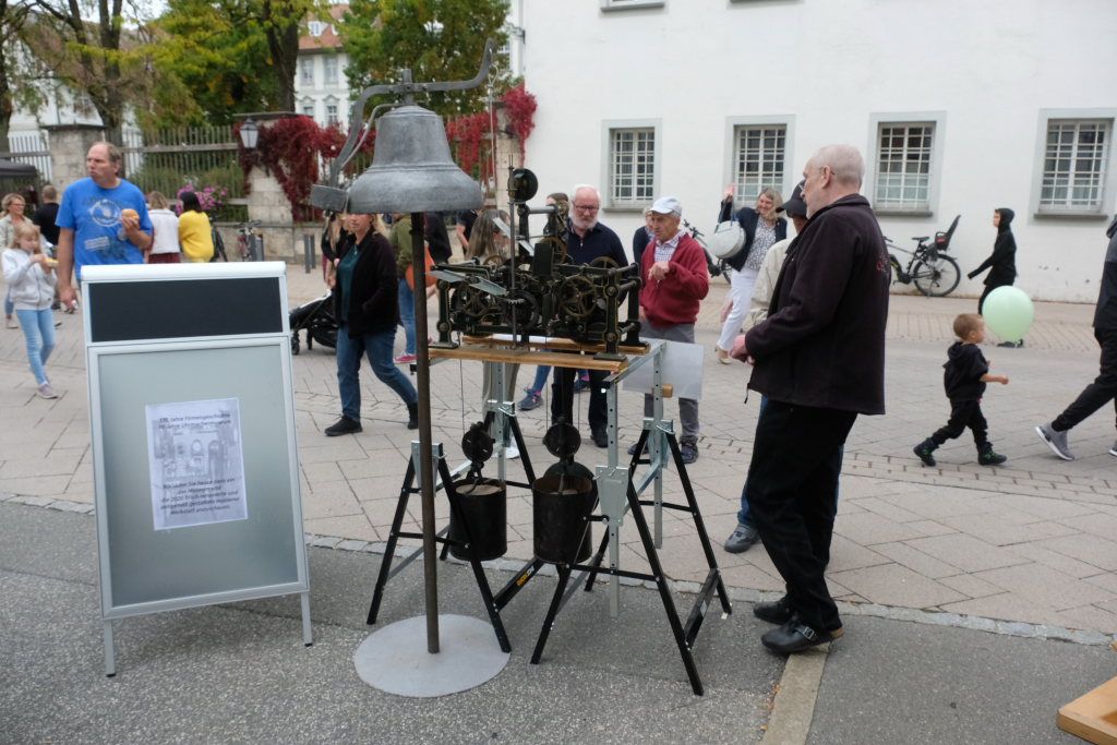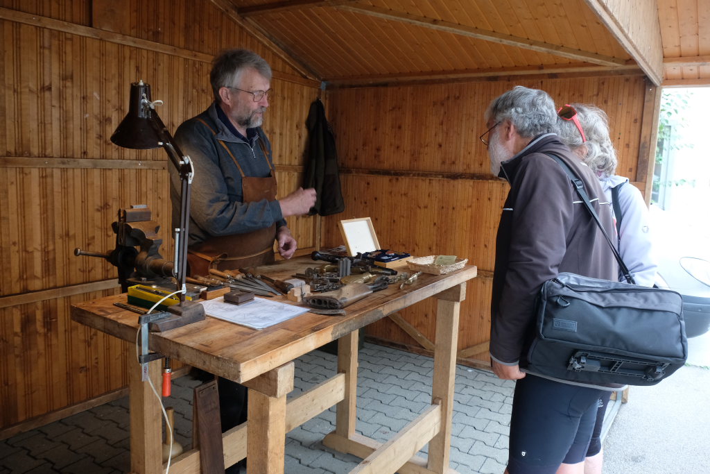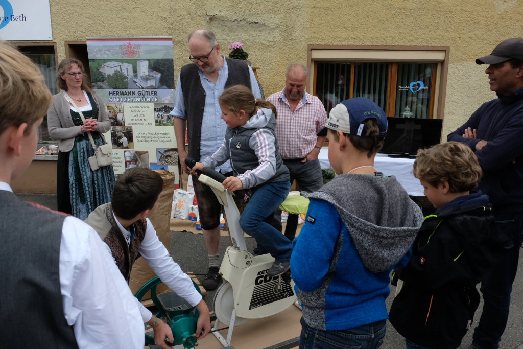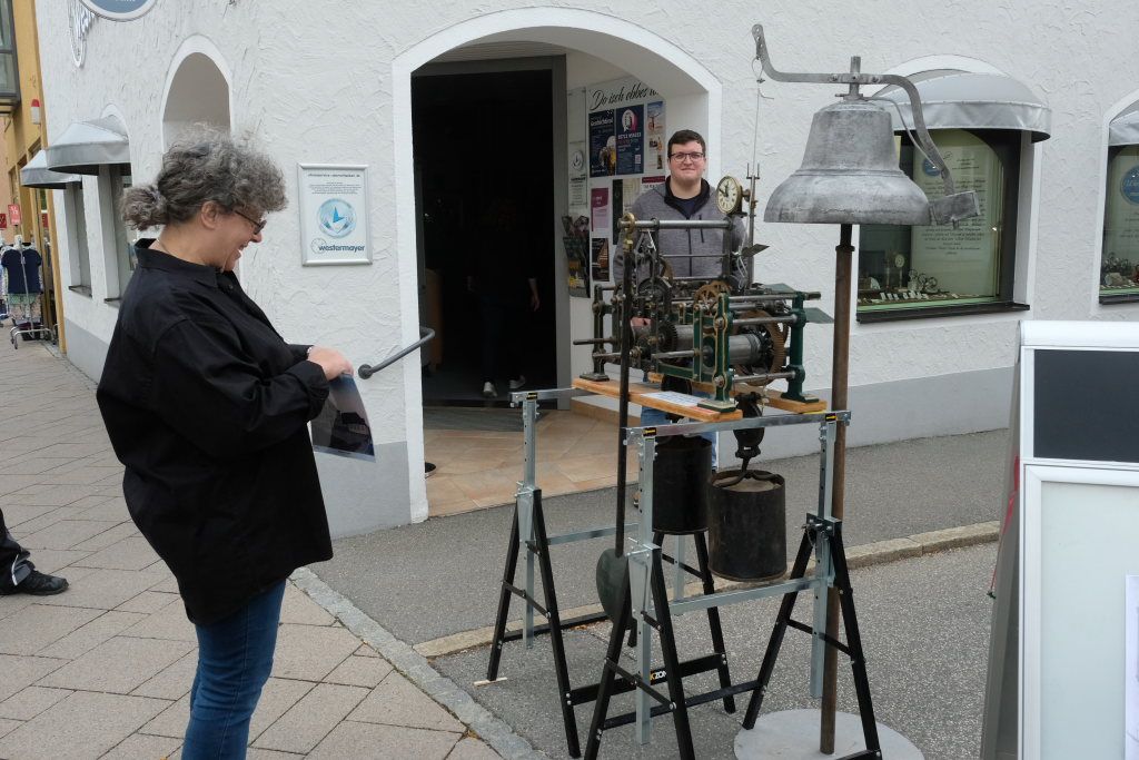 Nebenan in der Stadtbücherei konnten sich Kinder an einer märchenhaften Geschichte freuen, während die Erwachsenen nach Lust und Laune im Bücherflohmarkt stöbern konnten. Einige Schritte stadteinwärts konnte man, nachdem man die Autoausstellung eines Wurzacher Autohaus passiert hatte, beim Eingang zur Bürgerstraße beim „Uhrenflüsterer“ Westermayer, dessen Vorfahr vor 135 Jahren das Geschäft gegründet hatte, das ehemalige Uhr- und Schlagwerk der Grundschule bewundern. Das bildete gemeinsam mit dem gegenüberliegen Stand der Druckerei Rothenhäusler, die Einblicke in Historie des Druckens zeigte, den Eingang zum historischen Handwerkermarkt, bei dem ein Büchsenmacher sein Handwerk präsentierte, Schornsteinfeger kleine Glücksbringer verschenkten, ein Schreiner die Präzision seines Handwerkes aufzeigte. Am Stelzenmühlemühle-Stand konnte jeder mittels eines Hometrainer-Fahrrades sein Mehl auf historische Art selbst mahlen.