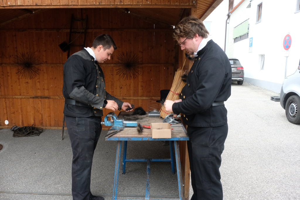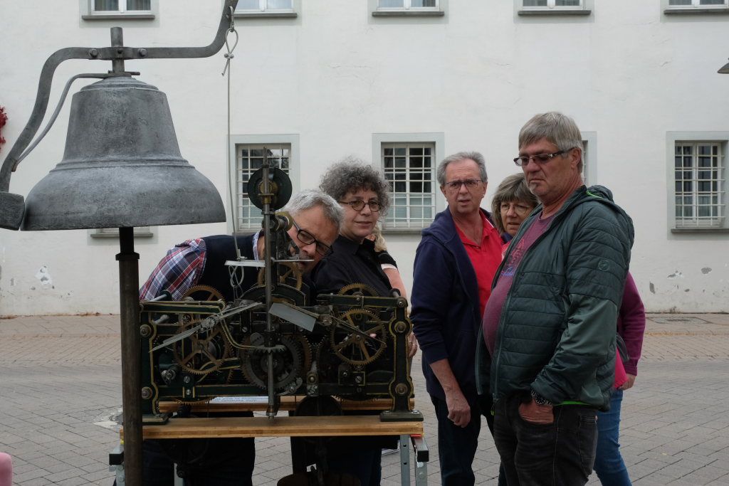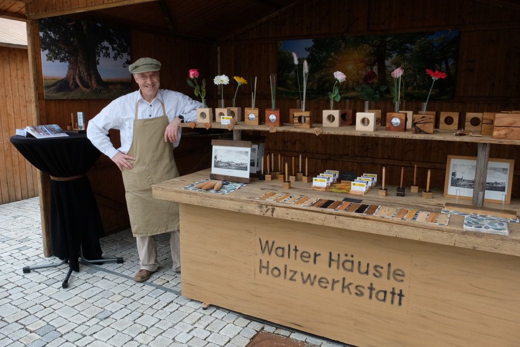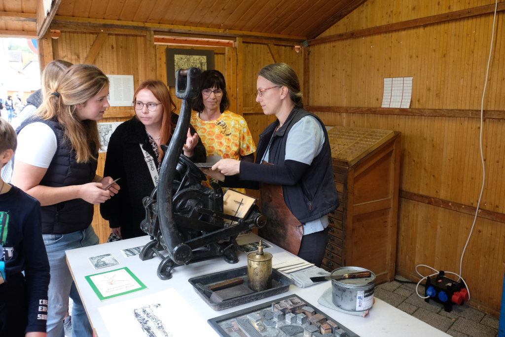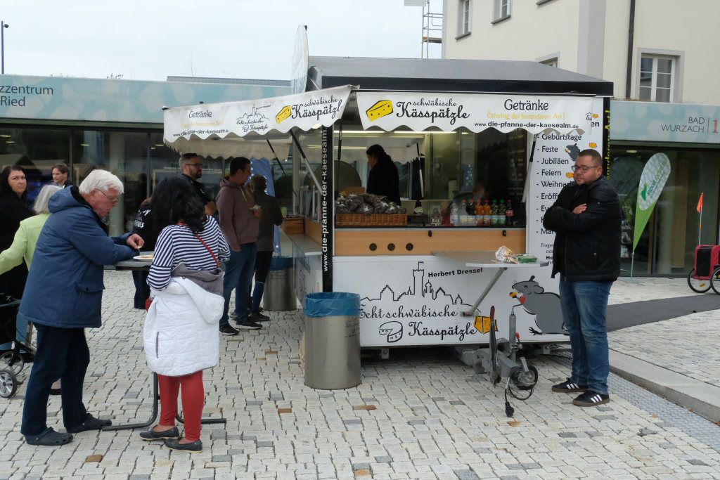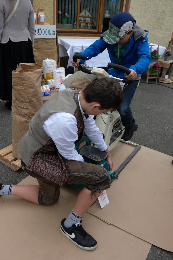 Nebenan in der Stadtbücherei konnten sich Kinder an einer märchenhaften Geschichte freuen, während die Erwachsenen nach Lust und Laune im Bücherflohmarkt stöbern konnten. Einige Schritte stadteinwärts konnte man, nachdem man die Autoausstellung eines Wurzacher Autohaus passiert hatte, beim Eingang zur Bürgerstraße beim „Uhrenflüsterer“ Westermayer, dessen Vorfahr vor 135 Jahren das Geschäft gegründet hatte, das ehemalige Uhr- und Schlagwerk der Grundschule bewundern. Das bildete gemeinsam mit dem gegenüberliegen Stand der Druckerei Rothenhäusler, die Einblicke in Historie des Druckens zeigte, den Eingang zum historischen Handwerkermarkt, bei dem ein Büchsenmacher sein Handwerk präsentierte, Schornsteinfeger kleine Glücksbringer verschenkten, ein Schreiner die Präzision seines Handwerkes aufzeigte. Am Stelzenmühlemühle-Stand konnte jeder mittels eines Hometrainer-Fahrrades sein Mehl auf historische Art selbst mahlen.