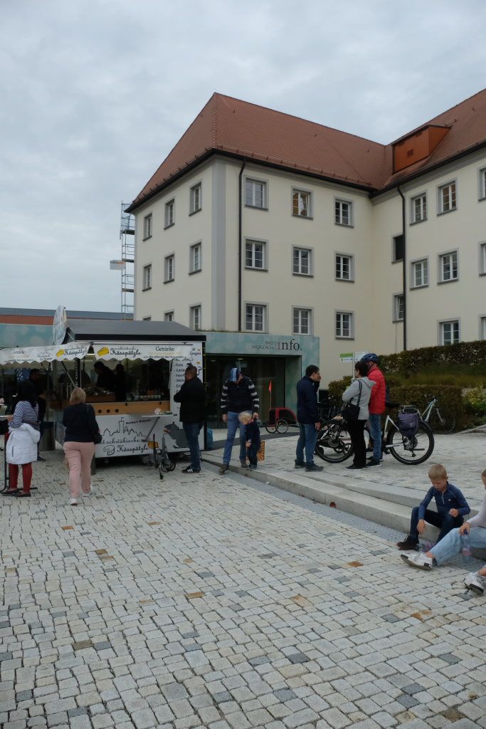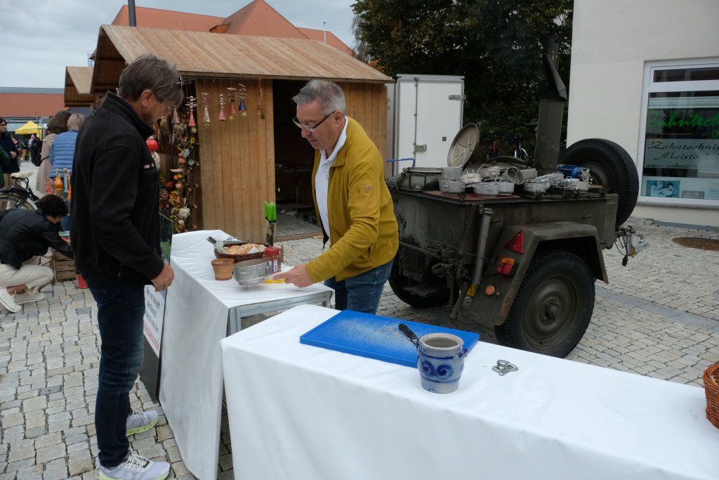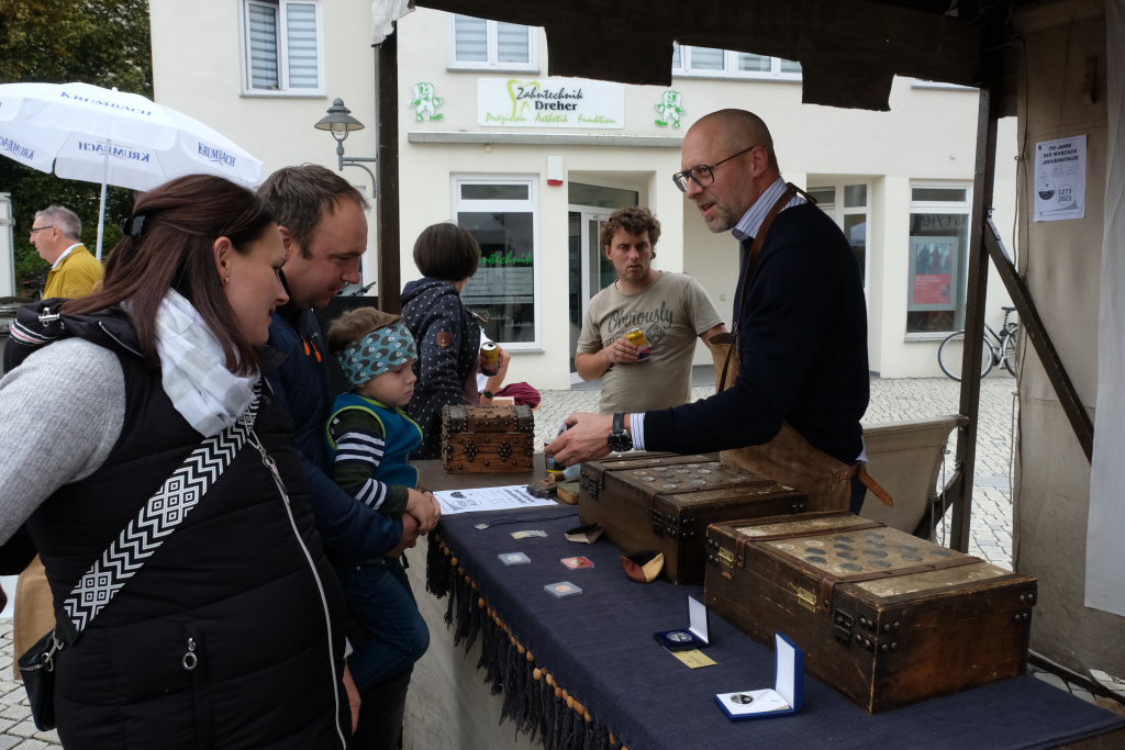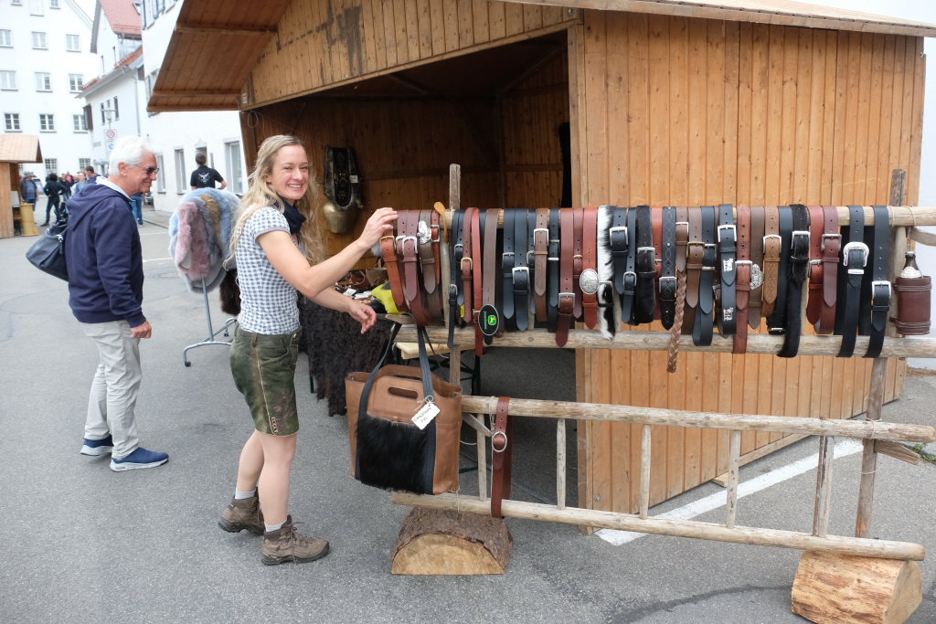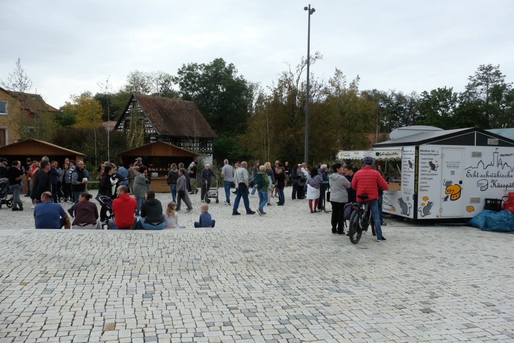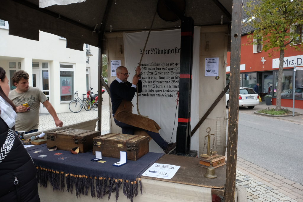Es war viel geboten an diesem verkaufsoffenen Sonntag. Auf dem Klosterplatz empfingen Stände eines Bauernmarktes die Besucher. Zum großen Teil waren die Händler dort, die unter anderem Spezialitäten wie Allgäuer Kässpätzle, schwäbische Dinnete,oder aus einer Original-NVA-Gulaschkanone das namensgebenden deftige Gericht sowie Brot-, Wurst- und Fleischwaren feilboten, dem Anlass entsprechen in historische Gewänder gehüllt. Auch ein Schreiner bot in historischer Tracht seine handgefertigten Waren an, während am anderen Ende des Platzes der Münzpräger mit seinem drei Meter hohen Fallhammer die Besucher ein ums andere Mal zusammenzucken ließ.