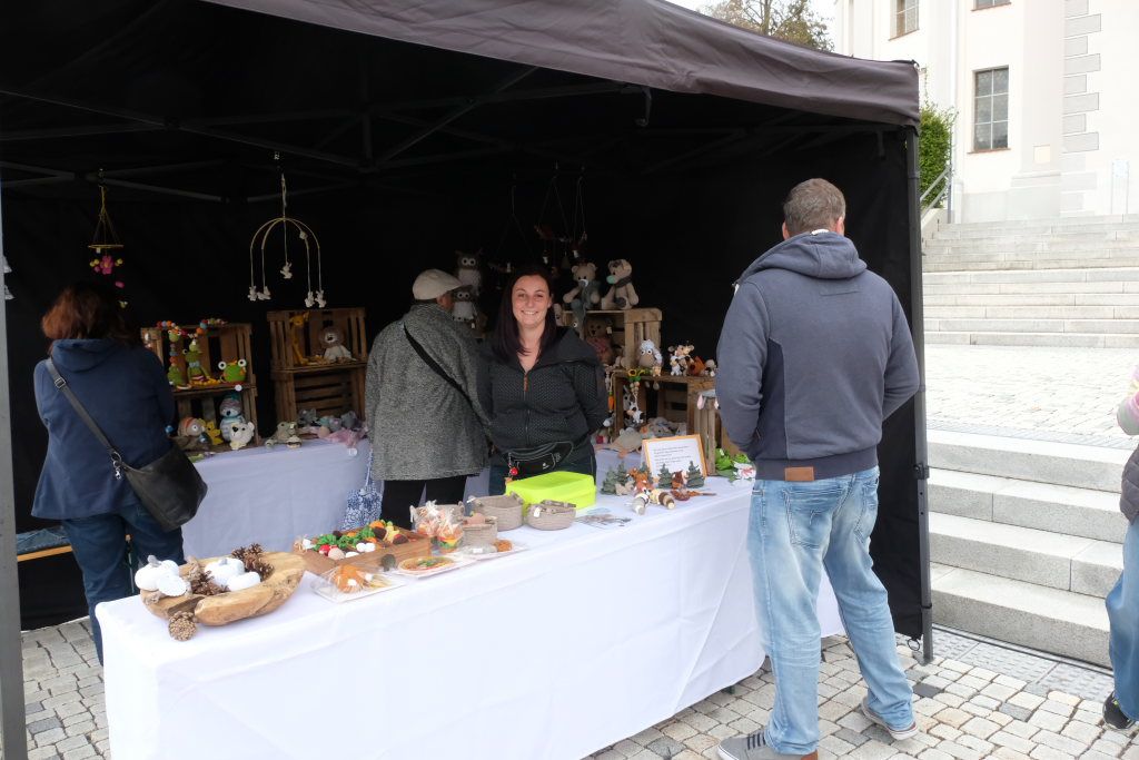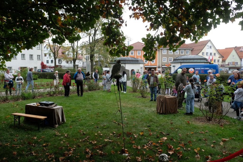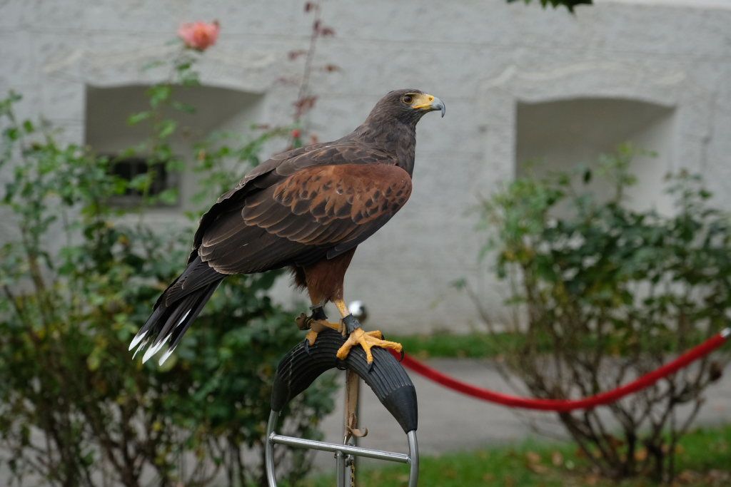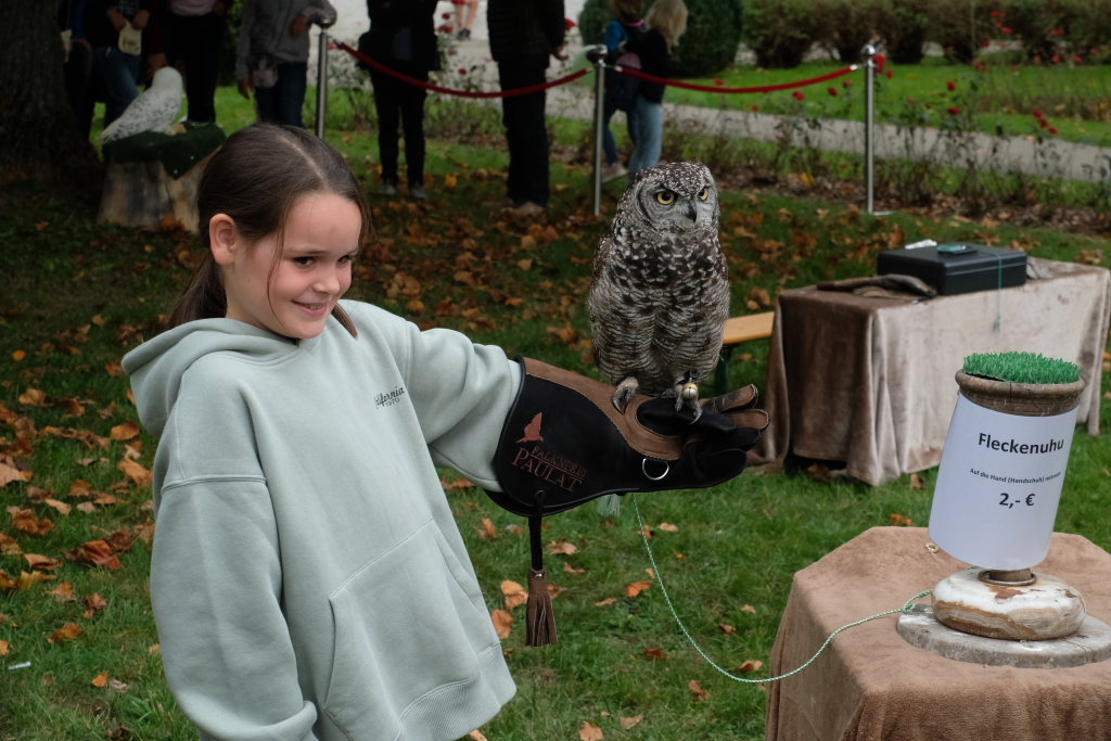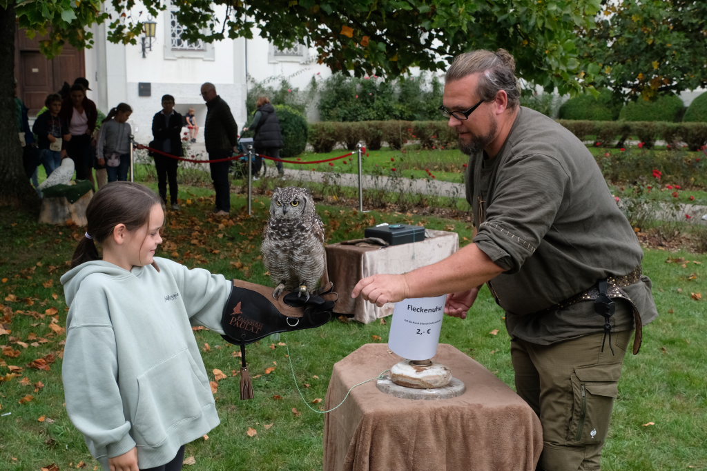 Ein Abstecher in den gegenüberliegenden Schloss lohnte sich: Die Falknerei Paulat hatte mehrere ihrer edlen Tiere mitgebracht, mit dem zahmen Fleckenuhu konnte gegen eine kleine Gebühr mit dem Tier auf dem Handschuh Fotos gemacht werden.
