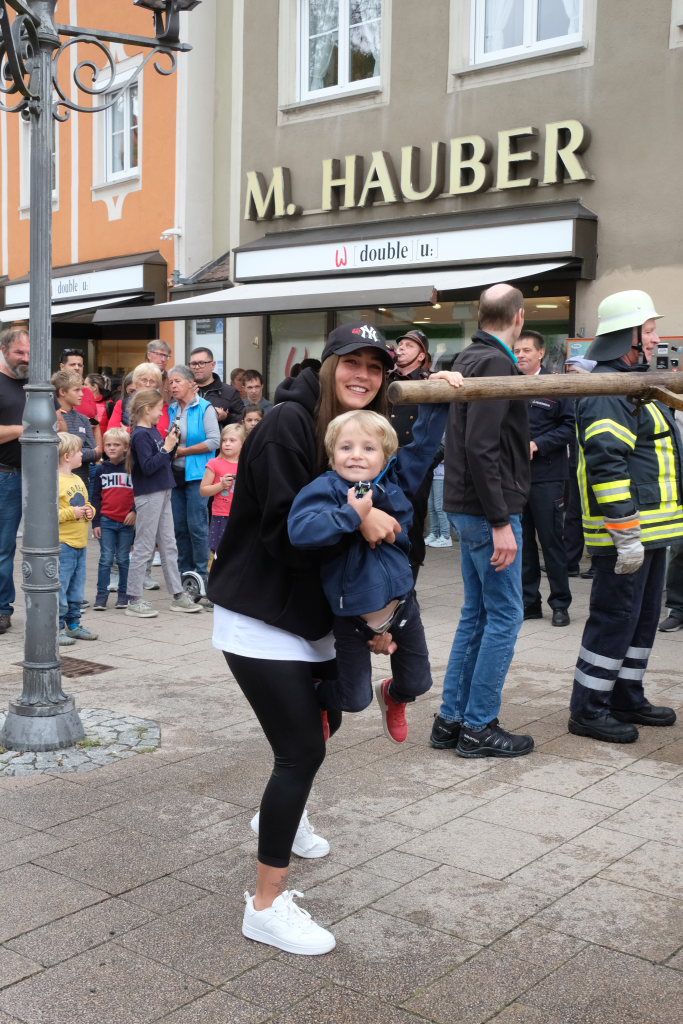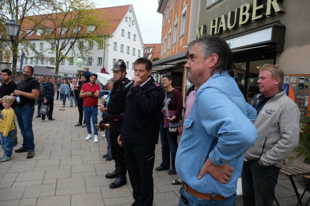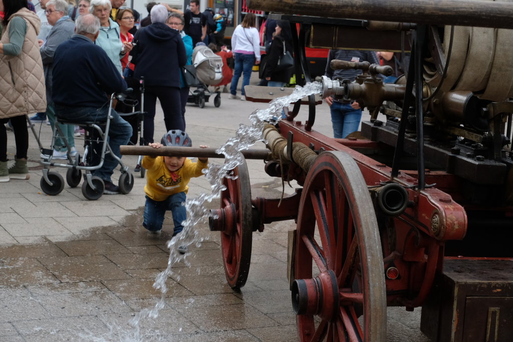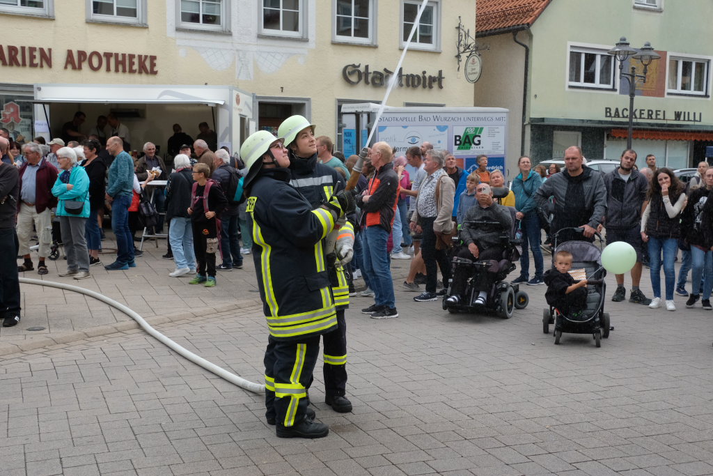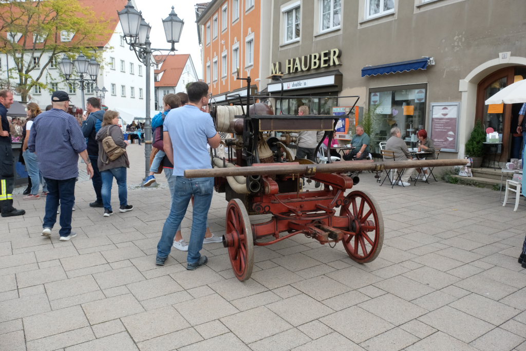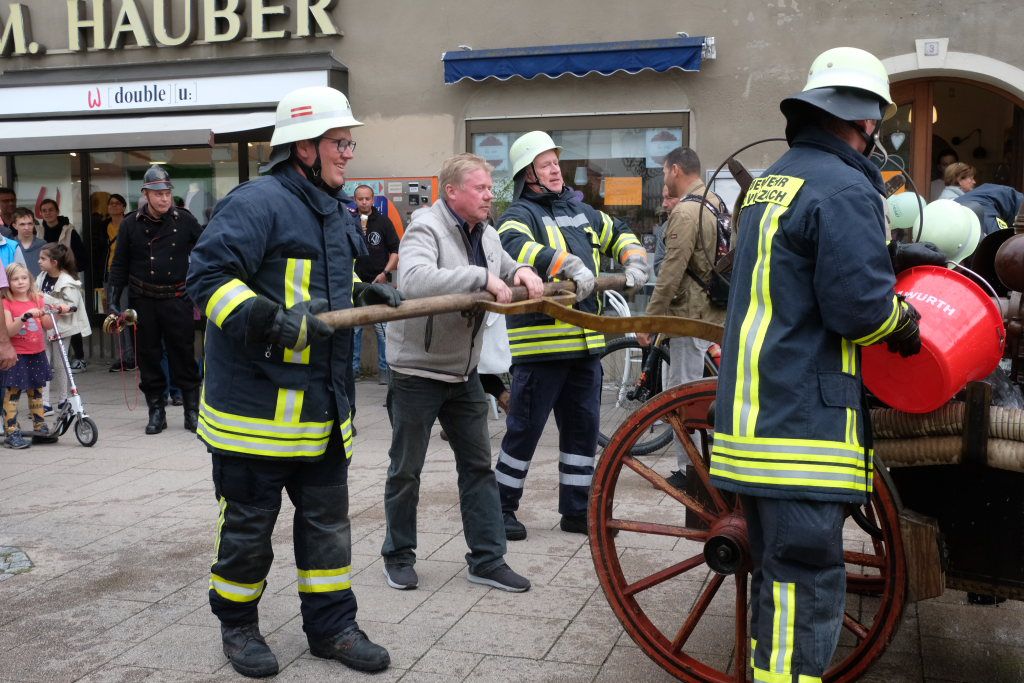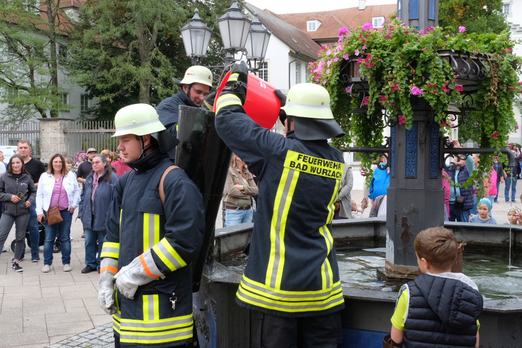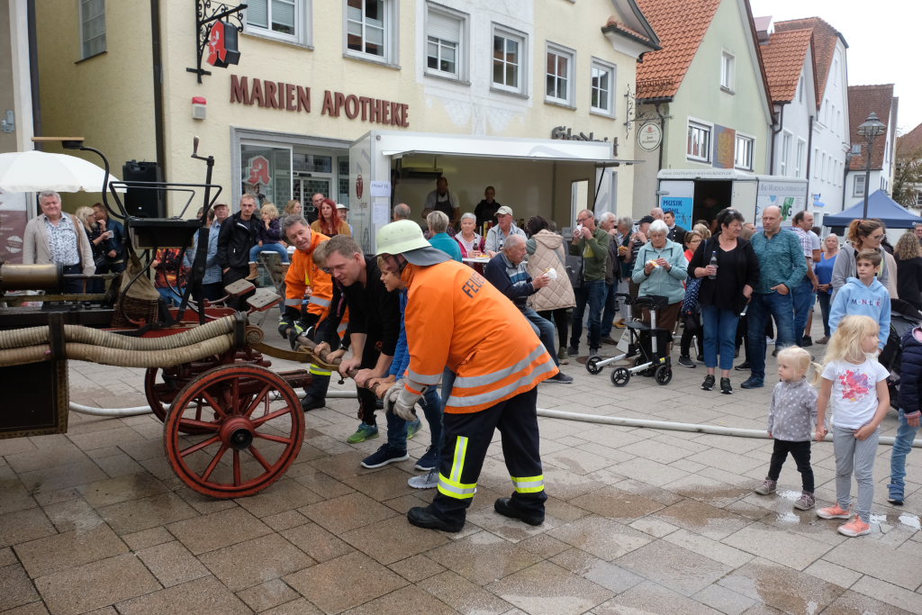 Vorbei an zahlreichen Flohmarktständen führte der Weg über den Viehmarkt und die Schlossstraße wieder auf Bad Wurzachs Hauptverkehrsachse, die Marktstraße und den Platz beim Marienbrunnen, wo die Feuerwehr aus Dietmanns mit ihrer historischen, mit Muskelkraft betriebenen rund 150 Jahre alten Feuerwehrpumpe gleich zweimal das Rathausdach „säuberten“.