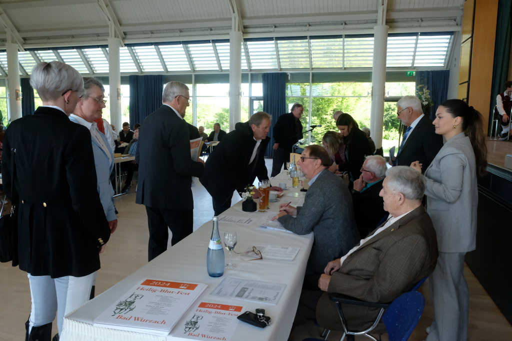 Bad Wurzach – Traditionell am Pfingstmontag findet in Bad Wurzach die Blutreitergruppenführerversammlung im Kurhaus statt, bei der viele organisatorische Details zum am zweiten Freitag im Juli stattfindenden Heilig-Blut-Fest mit den Gruppenführern geklärt und verdiente Blutreiter und Musikanten geehrt werden.
