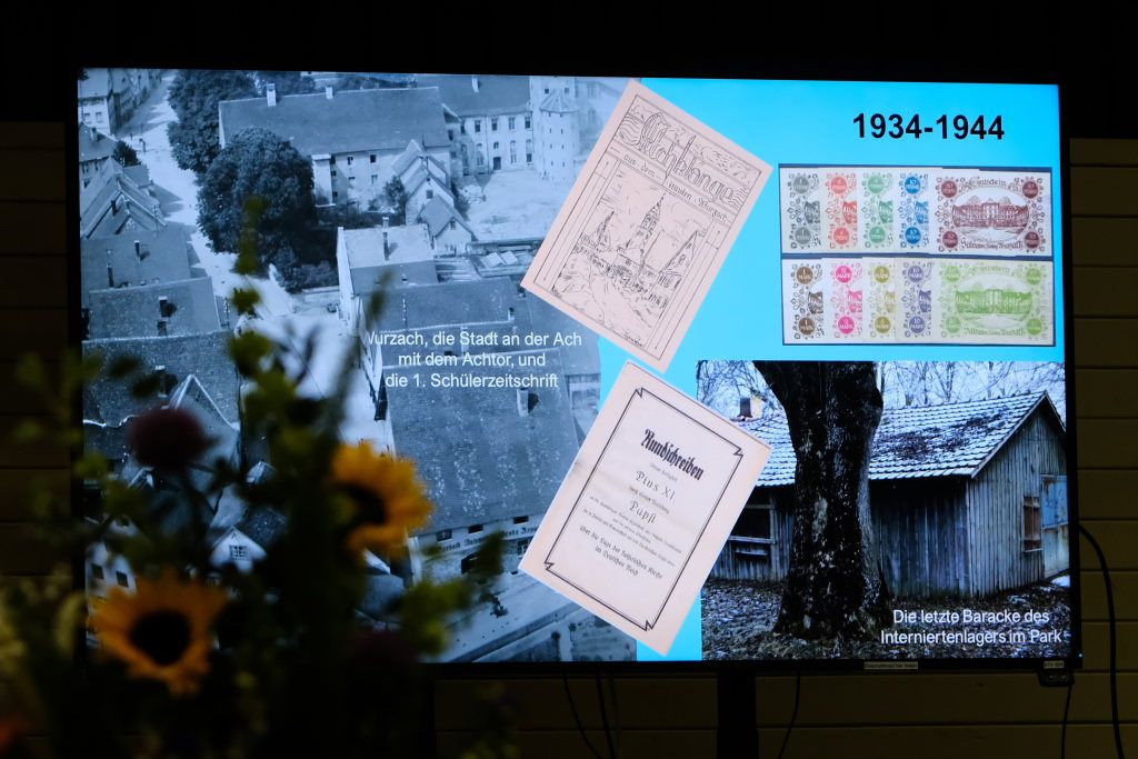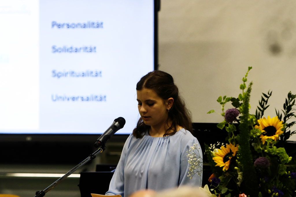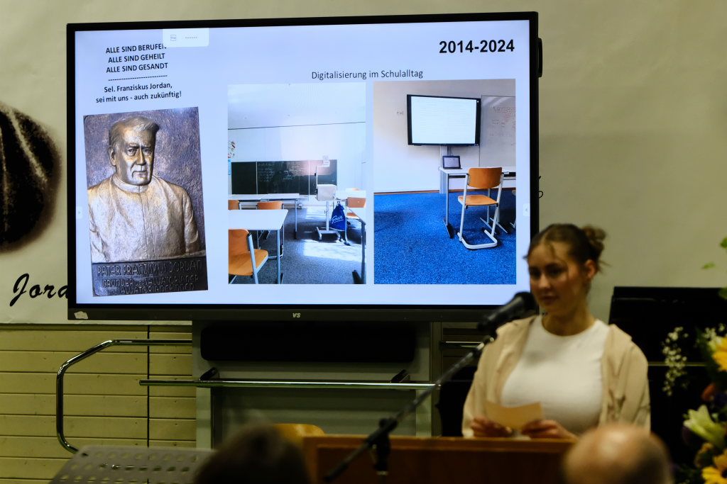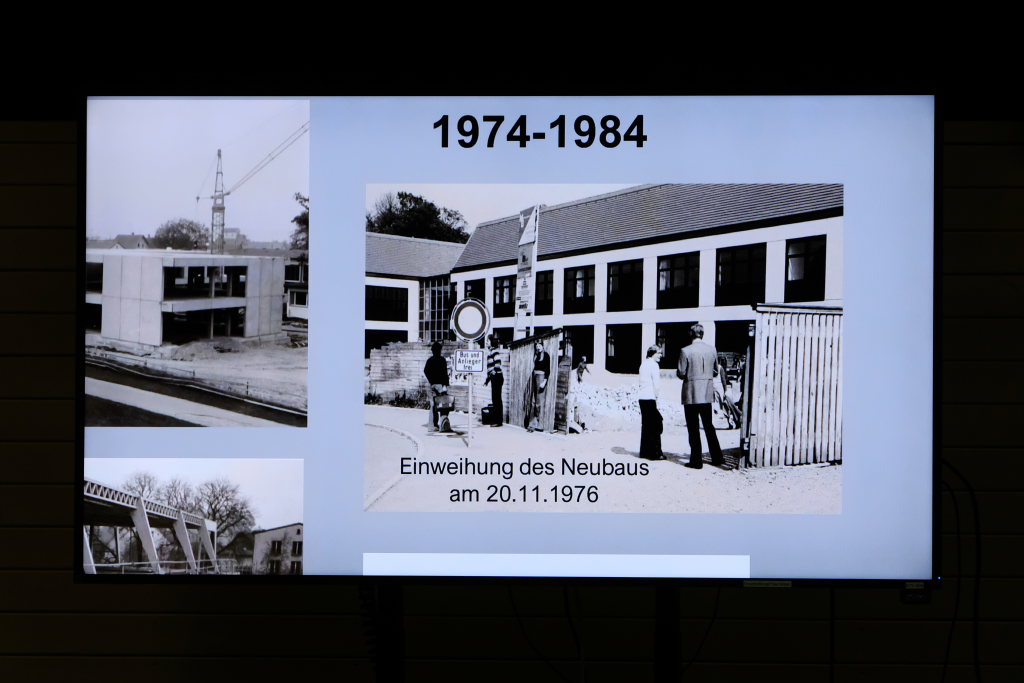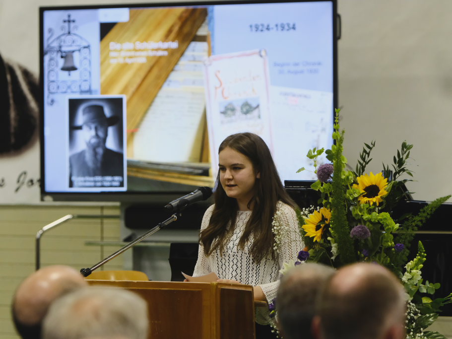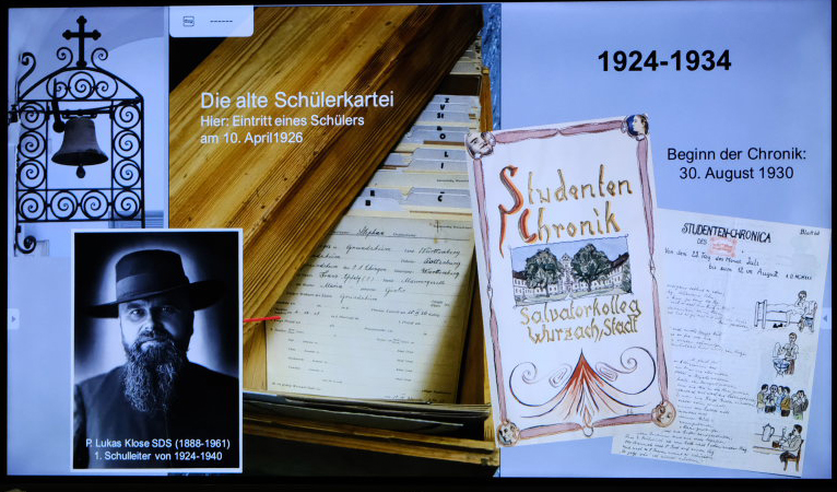 Nach einem weiteren Musikstück des extra für das Jubiläum gebildeten Vokalensembles „Re-United“, bei dem – wie Klaus Amann launig bemerkte – Abiturjahrgänge von 2014 bis 2028 vertreten sind, legten die Schüler/innen aus dem Leistungsfach Geschichte der Kursstufe 1 (Klasse 11) mit ihrer Zusammenfassung der 100-jährigen Geschichte der Schule, vorgetragen mit ihrem Geschichtslehrer Christoph Sigg, los. Pater Michael Overmann, Archivar der deutschen Provinz der Salvatorianer, hatte die Präsentation mit Archiv-Material unterstützt. Die nachstehend genannten Stationen der 100-jährigen Geschichte sind dem Vortrag entnommen. Die zugehörige Festschrift wurde von der 10b erarbeitet (Klassenlehrer: Markus Benzinger); sie wurde inzwischen an Freunde und Partner des Salvatorkollegs verschickt. Interessierte können die sehr informative Schrift bei der Schule beziehen (Spende erwünscht).