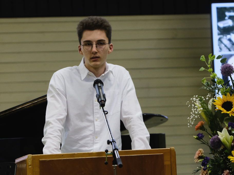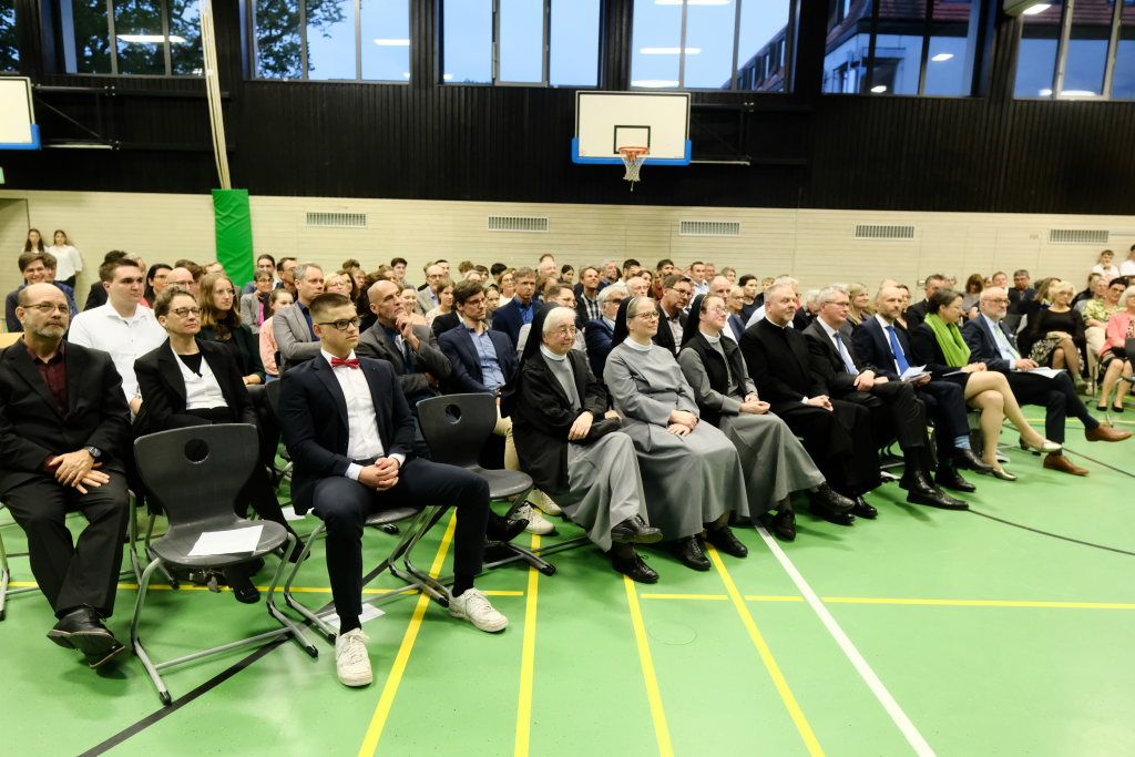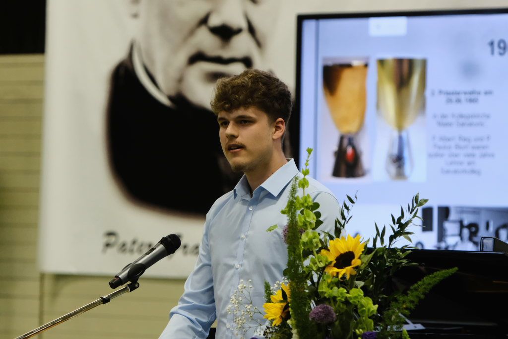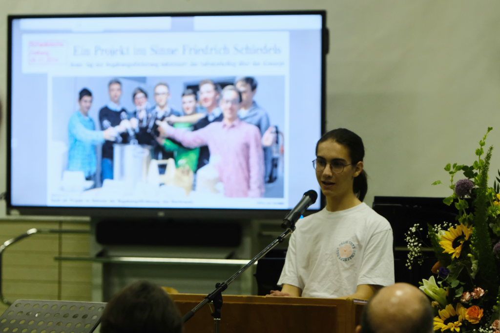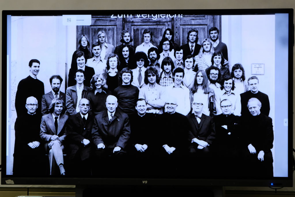 Nach einem weiteren Musikstück des extra für das Jubiläum gebildeten Vokalensembles „Re-United“, bei dem – wie Klaus Amann launig bemerkte – Abiturjahrgänge von 2014 bis 2028 vertreten sind, legten die Schüler/innen aus dem Leistungsfach Geschichte der Kursstufe 1 (Klasse 11) mit ihrer Zusammenfassung der 100-jährigen Geschichte der Schule, vorgetragen mit ihrem Geschichtslehrer Christoph Sigg, los. Pater Michael Overmann, Archivar der deutschen Provinz der Salvatorianer, hatte die Präsentation mit Archiv-Material unterstützt. Die nachstehend genannten Stationen der 100-jährigen Geschichte sind dem Vortrag entnommen. Die zugehörige Festschrift wurde von der 10b erarbeitet (Klassenlehrer: Markus Benzinger); sie wurde inzwischen an Freunde und Partner des Salvatorkollegs verschickt. Interessierte können die sehr informative Schrift bei der Schule beziehen (Spende erwünscht).