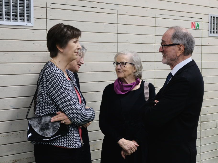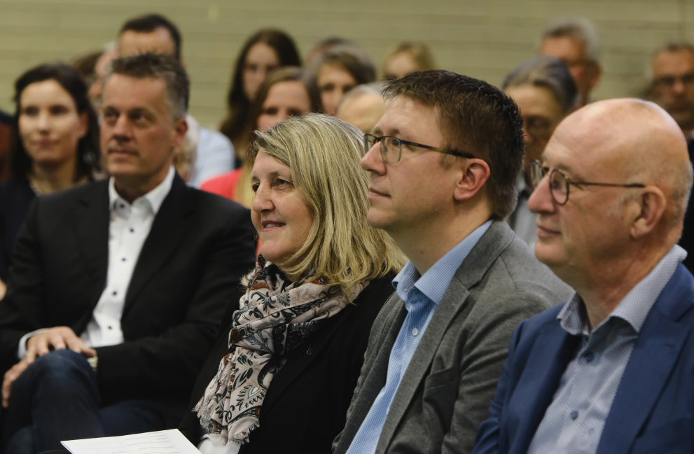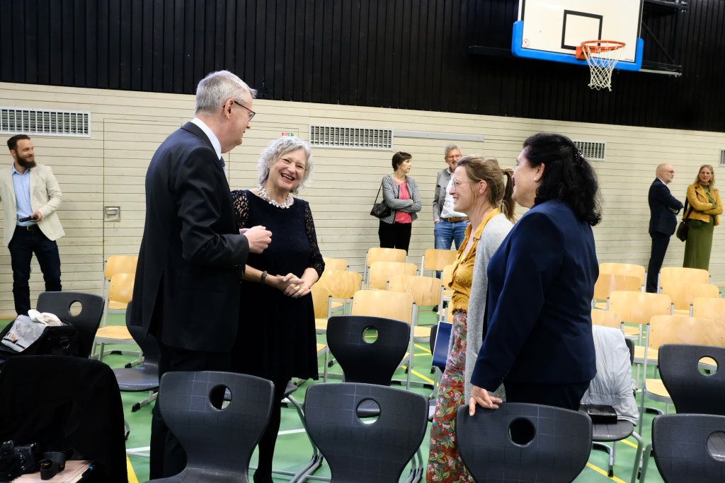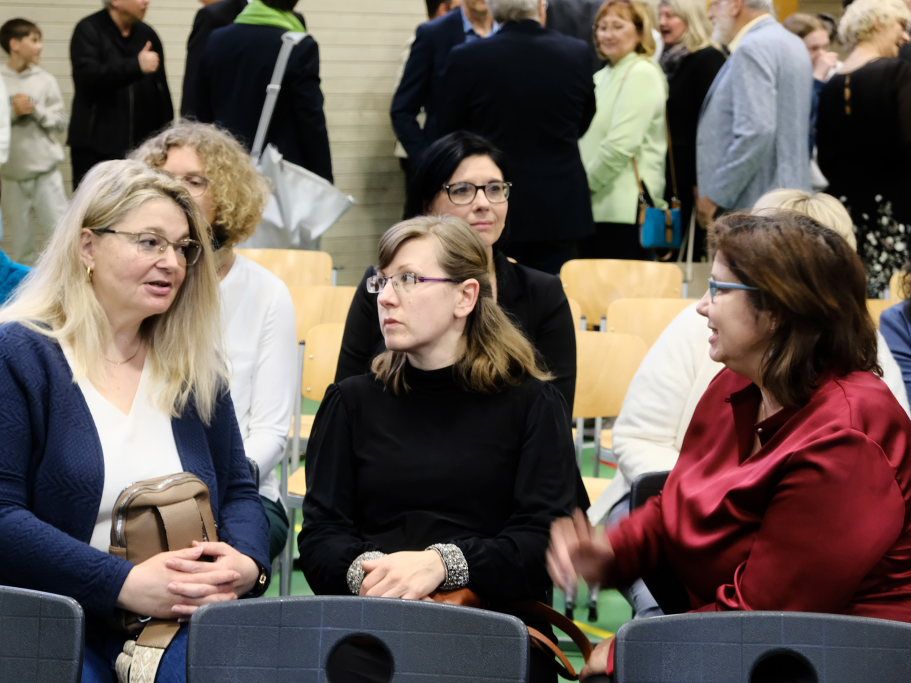 In ihrem Grußwort ging Bürgermeisterin Alexandra Scherer (rechts im Bild ihr Vorgänger Roland Bürkle) auf die Entwicklung von der Lateinschule zur modernen, weit über die Region hinaus bekannte Bildungseinrichtung ein. Sie beleuchtete dabei auch die Rolle der Stadt bei dem Vertrag, den Mitte der 1970er-Jahre der damalige Bürgermeister Georg Hirth mit den Salvatorianern schloss. Darin wurde geregelt, dass es ein Gymnasium für alle, Mädchen wie Jungen und egal welcher Konfession und welcher Nationalität werden sollte. Im Gegenzug erhielt die Schule einen großen Baukosten-Zuschuss für den Neubau und war fortan eine Privatschule mit öffentlichem Auftrag.