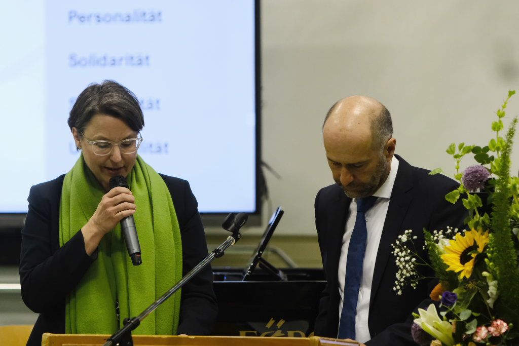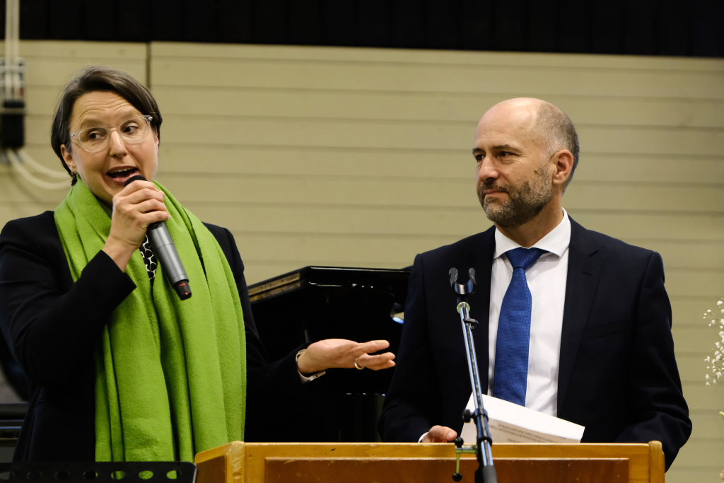 Die Geschäftsführer des Ordensschulen-Trägerverbundes (Bild), Hans-Peter Staiber und Wibke Tiedmann, gestalteten ihr Grußwort als eine Art Interview, in dem die Beiden das Besondere des Schulprofils heraushoben, wie etwa die Weltoffenheit durch die Schüleraustausche und die Auslandsaufenthalte, die sehr wesentlich zur Persönlichkeitsentwicklung des Einzelnen beitragen.